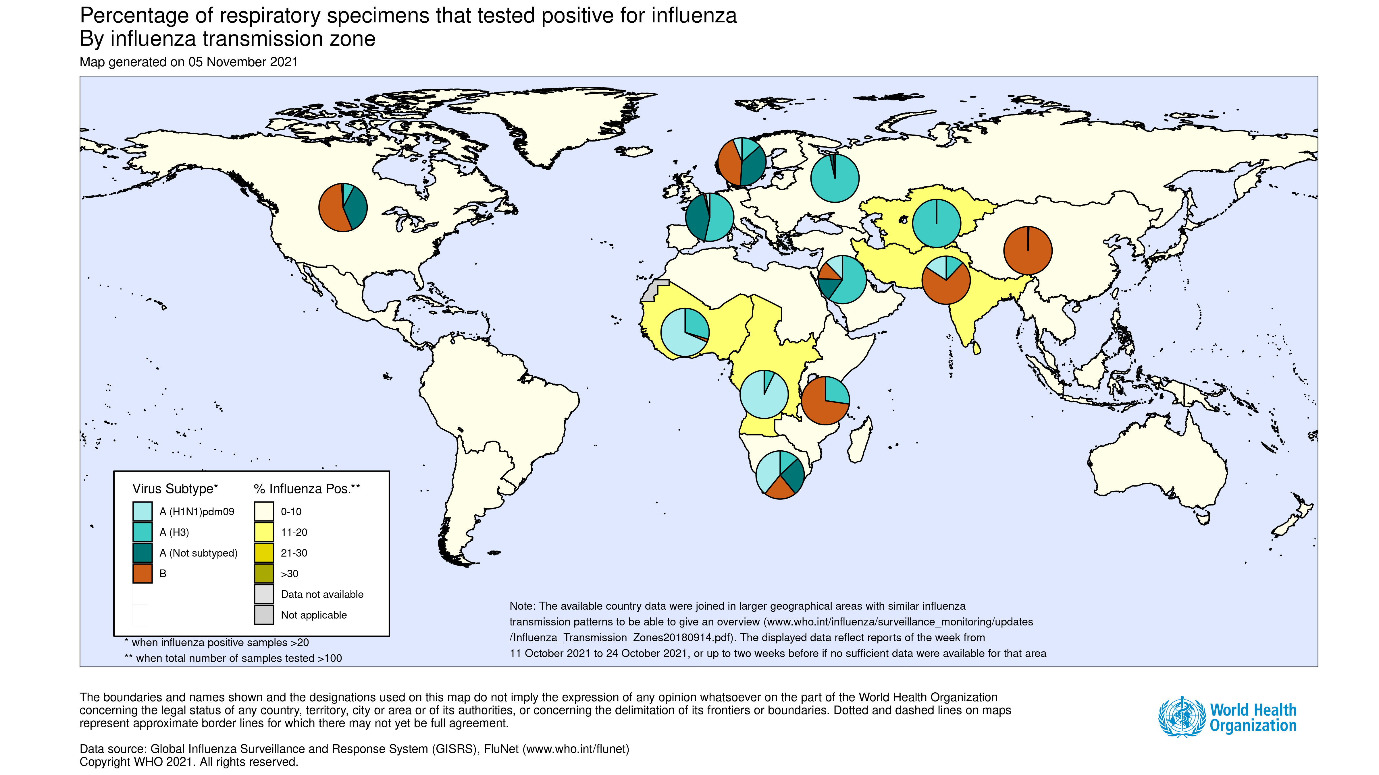 - National Influenza Centres (NICs) and other national influenza laboratories from 102 countries, areas or territories reported data to FluNet for the time period from 11 October 2021 to 24 October 2021 (data as of 2021-11-05 10:02:16 UTC).The WHO GISRS laboratories tested more than 307999 specimens during that time period. 2199 were positive for influenza viruses, of which 875 (39.8%) were typed as influenza A and 1324 (60.2%) as influenza B. Of the sub-typed influenza A viruses, 186 (36.2%) were influenza A(H1N1)pdm09 and 328 (63.8%) were influenza A(H3N2). Of the characterized B viruses, 1 (0.1%) belonged to the B-Yamagata lineage and 1176 (99.9%) to the B-Victoria lineage.