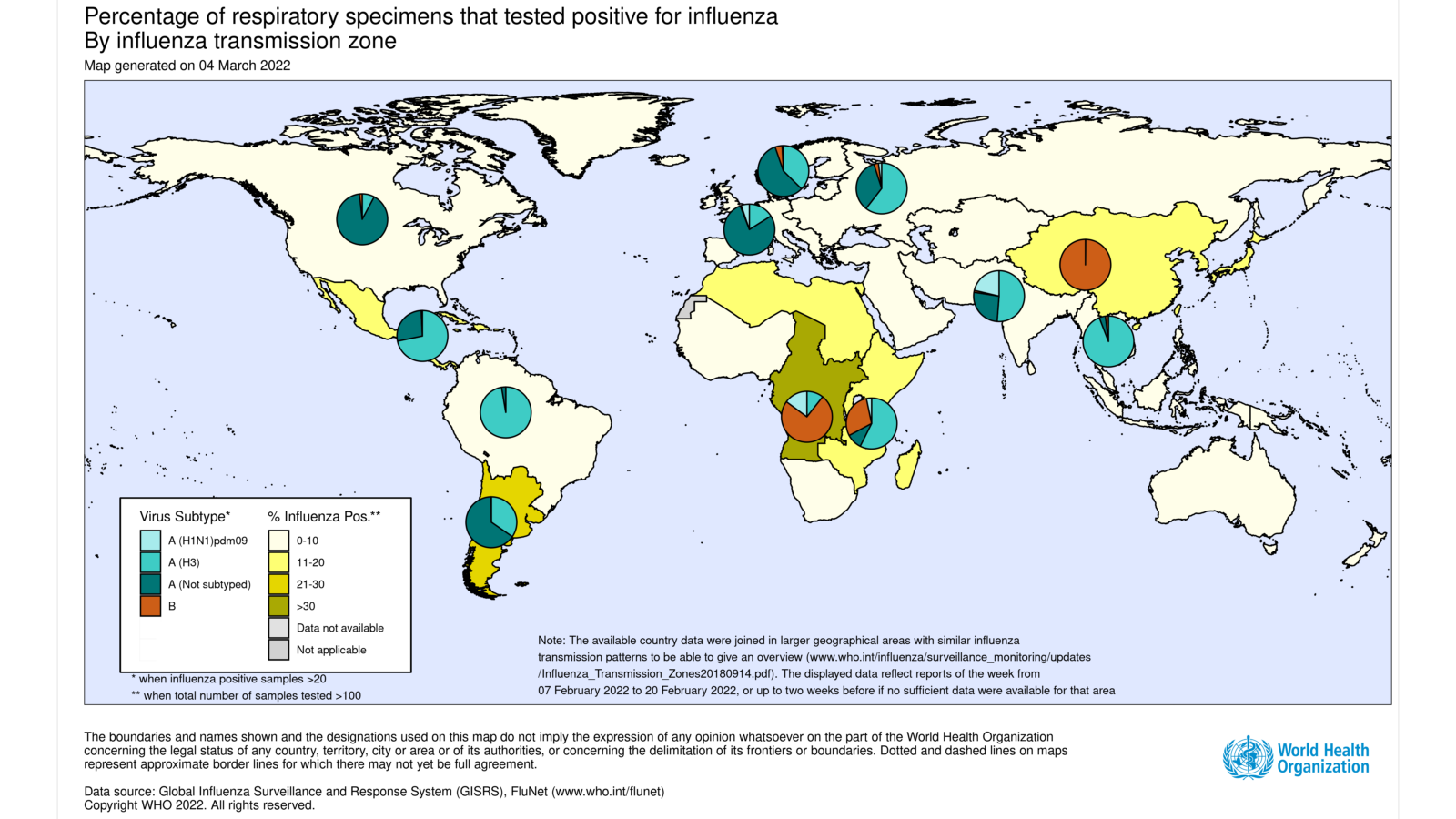 - National Influenza Centres (NICs) and other national influenza laboratories from 115 countries, areas or territories reported data to FluNet for the time period from 07 February 2022 to 20 February 2022* (data as of 2022-03-04 08:07:21 UTC). The WHO GISRS laboratories tested more than 419 390 specimens during that time period. A total of 13 619 specimens were positive for influenza viruses, of which 9 346 (68.6%) were typed as influenza A and 4 273 (31.4%) as influenza B. Of the subtyped influenza A viruses, 224 (11.1%) were influenza A(H1N1)pdm09 and 1 797 (88.9%) were influenza A(H3N2). Of the type B viruses for which lineage was determined, 4 085 (100%) belonged to the B-Victoria lineage.