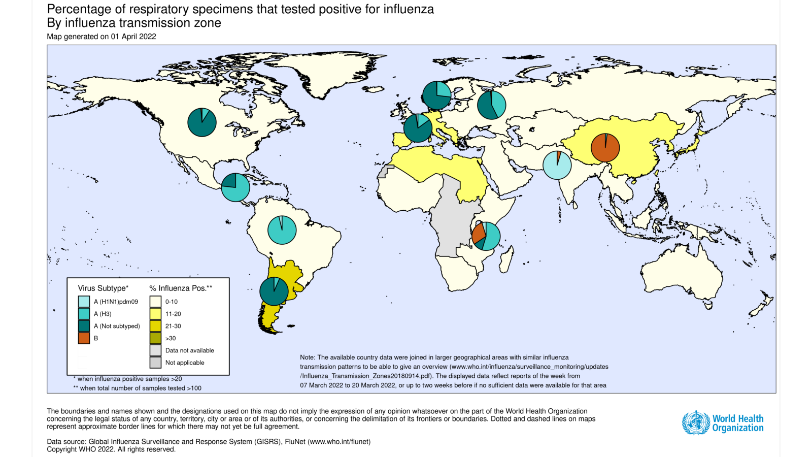 - National Influenza Centres (NICs) and other national influenza laboratories from 111 countries, areas or territories reported data to FluNet for the time period from 07 March 2022 to 20 March 2022* (data as of 2022-04-01 06:58:55 UTC). The WHO GISRS laboratories tested more than 377 735 specimens during that time period. 32 703 were positive for influenza viruses, of which 29 030 (88.8%) were typed as influenza A and 3673 (11.2%) as influenza B. Of the sub-typed influenza A viruses, 315 (6.5%) were influenza A(H1N1)pdm09 and 4504 (93.5%) were influenza A(H3N2). Of the characterized B viruses, none belonged to the B-Yamagata lineage and 3440 (100%) to the B-Victoria lineage.