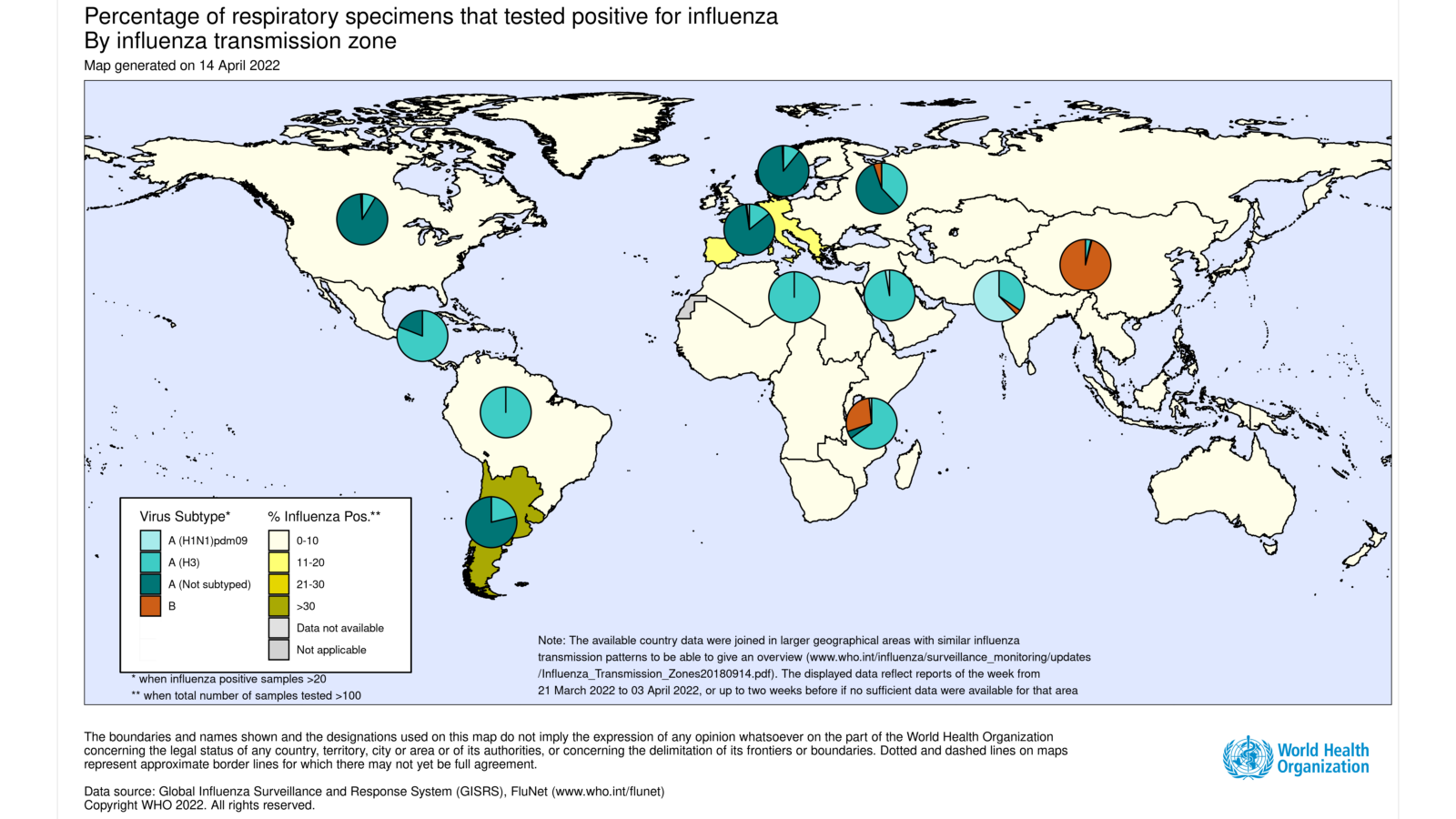 - National Influenza Centres (NICs) and other national influenza laboratories from 113 countries, areas or territories reported data to FluNet for the time period from 21 March 2022 to 03 April 2022* (data as of 2022-04-14 14:09:24 UTC). The WHO GISRS laboratories tested more than 351 420 specimens during that time period. 36 312 were positive for influenza viruses, of which35 040 (96.5%) were typed as influenza A and 1272 (3.5%) as influenza B. Of the sub-typed influenza A viruses, 275 (5.5%) were influenza A(H1N1)pdm09 and 4682 (94.5%) were influenza A(H3N2). Of the characterized B viruses, 1 (0.1%) belonged to the B-Yamagata lineage and 1005 (99.9%) to the B-Victoria lineage.