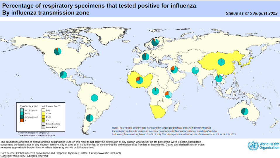 - National Influenza Centres (NICs) and other national influenza laboratories from 120 countries, areas or territories reported data to FluNet for the time period from 11 July 2022 to 24 July 2022 (data as of 5/8/2022 7:23:00 AM UTC). The WHO GISRS laboratories tested more than 145 086 specimens during that time period. 6449 were positive for influenza viruses, of which 6 301 (97.7%) were typed as influenza A and 148 (2.3%) as influenza B. Of the subtyped influenza A viruses, 157 (2.7%) were influenza A(H1N1)pdm09 and 5640 (97.3%) were influenza A(H3N2). Of the characterised influenza B viruses, 44 (100%) belonged to the B-Victoria lineage and none belonged to the Yamagata lineage.