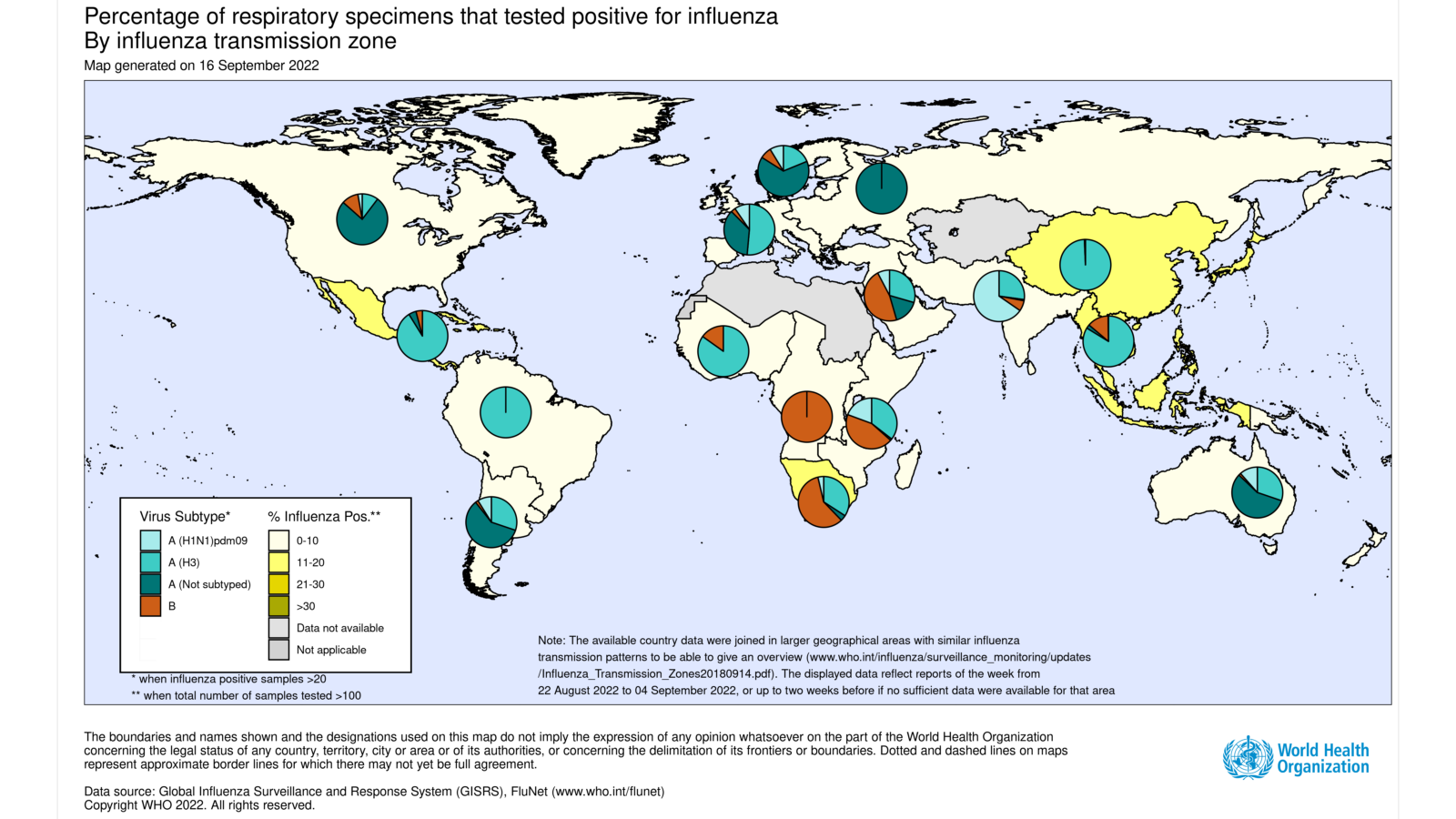 - National Influenza Centres (NICs) and other national influenza laboratories from 102 countries, areas or territories reported data to FluNet for the time period from 22 August 2022 to 04 September 2022* (data as of 2022-09-16 04:55:15 UTC).The WHO GISRS laboratories tested more than 112 017 specimens during that time period. 3879 were positive for influenza viruses, of which 3585 (92.4%) were typed as influenza A and 294 (7.6%) as influenza B. Of the sub-typed influenza A viruses, 361 (12.3%) were influenza A(H1N1)pdm09 and 2578 (87.7%) were influenza A(H3N2). Of the characterized B viruses, 131 (100%) belonged to the B/Victoria lineage.