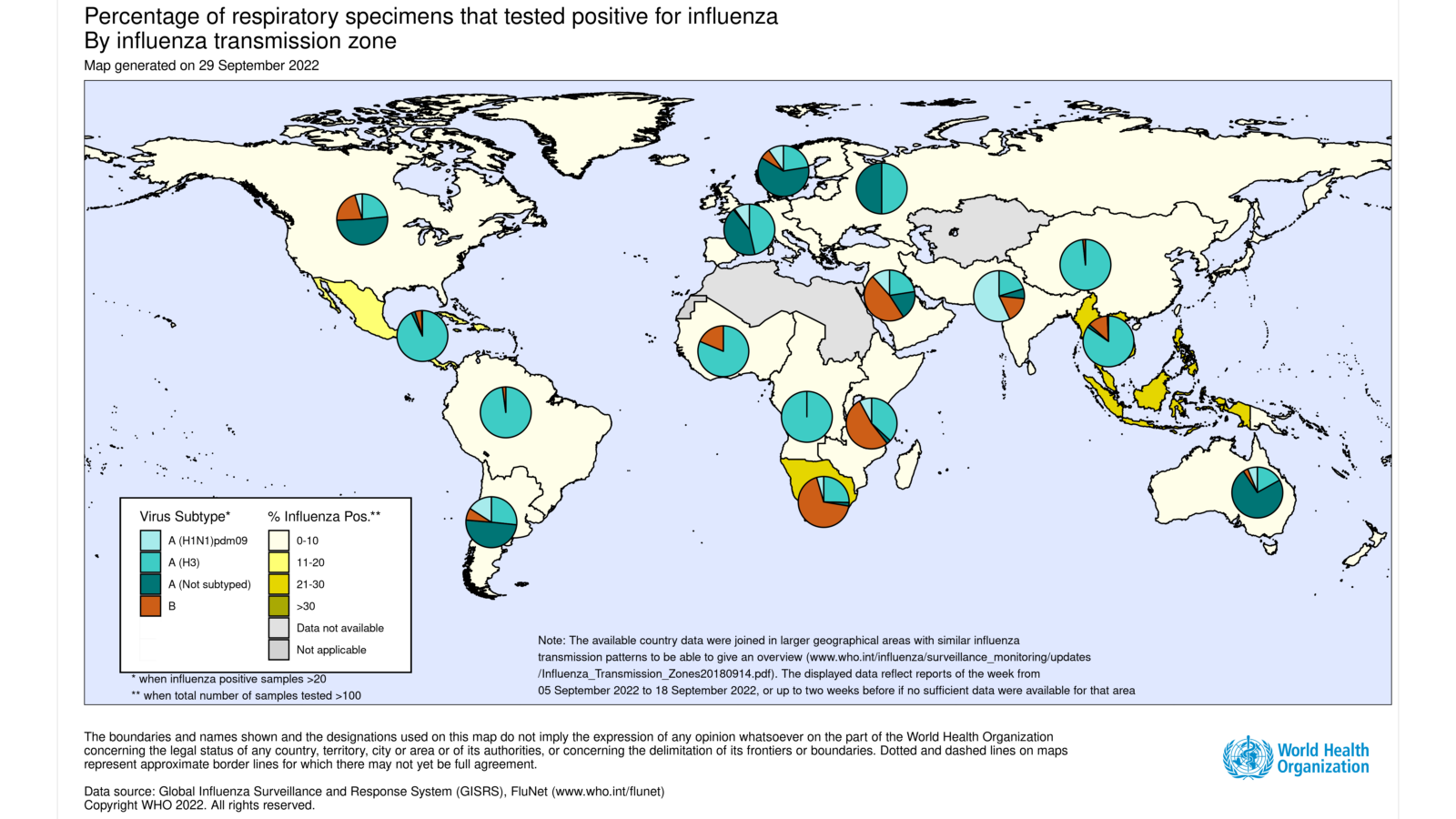 - National Influenza Centres (NICs) and and other national influenza laboratories from 99 countries, areas or territories reported data to FluNet for the time period from 05 September 2022 to 18 September 2022* (data as of 2022-09-29 15:56:25 UTC). The WHO GISRS laboratories tested more than 118 327 specimens during that time period. 4123 were positive for influenza viruses, of which 3650 (88.5%) were typed as influenza A and 473 (11.5%) as influenza B. Of the sub-typed influenza A viruses, 369 (13%) were influenza A(H1N1)pdm09 and 2463 (87%) were influenza A(H3N2). Of the characterized B viruses, all (169) belonged to the B-Victoria lineage.