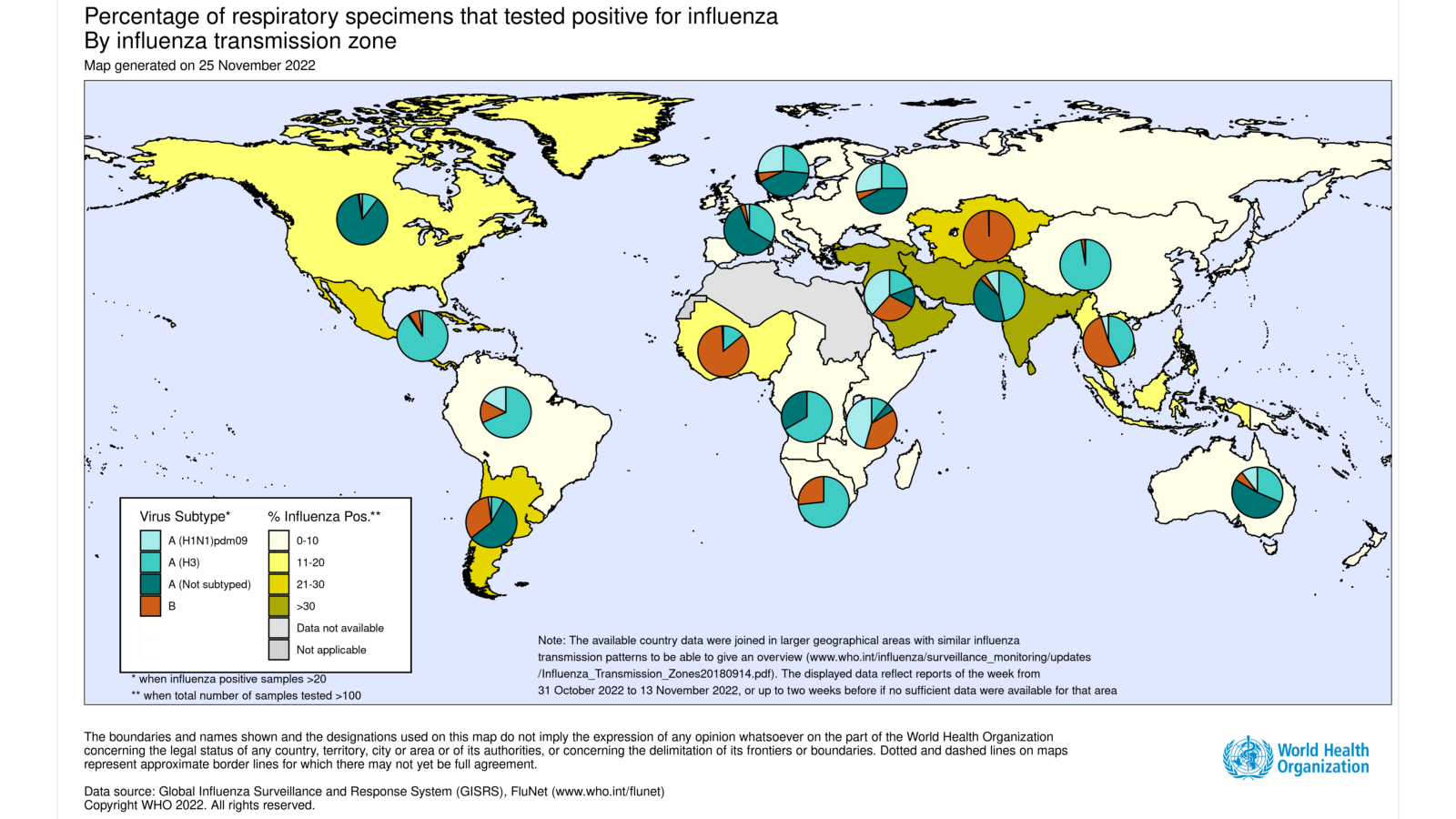 - National Influenza Centres (NICs) and other national influenza laboratories from 125 countries, areas or territories reported data to FluNet for the time period from 31 October 2022 to 13 November 2022* (data as of 2022-11-29 05:35:56 UTC). The WHO GISRS laboratories tested more than 465 365 specimens during that time period. 56 551 were positive for influenza viruses, of which 53 829 (95.2%) were typed as influenza A and 2 722 (4.8%) as influenza B. Of the sub-typed influenza A viruses, 2 024 (16.3%) were influenza A(H1N1)pdm09 and 10 356 (83.7%) were influenza A(H3N2). Of the characterized B viruses (550), 100% belonged to the B-Victoria lineage.