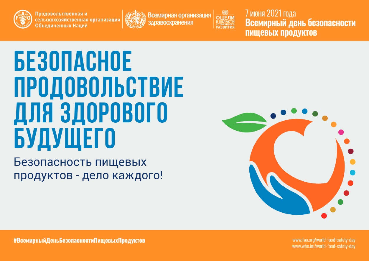 Всемирный день безопасности пищевых продуктов, отмечаемый 7 июня 2021 г., имеет целью привлечь внимание к рискам пищевого происхождения и стимулировать действия по предотвращению и управлению этими рисками, что способствует продовольственной безопасности, укреплению здоровья людей, экономическому процветанию, сельскохозяйственному производству, доступу на рынки, туризму и устойчивому развитию.