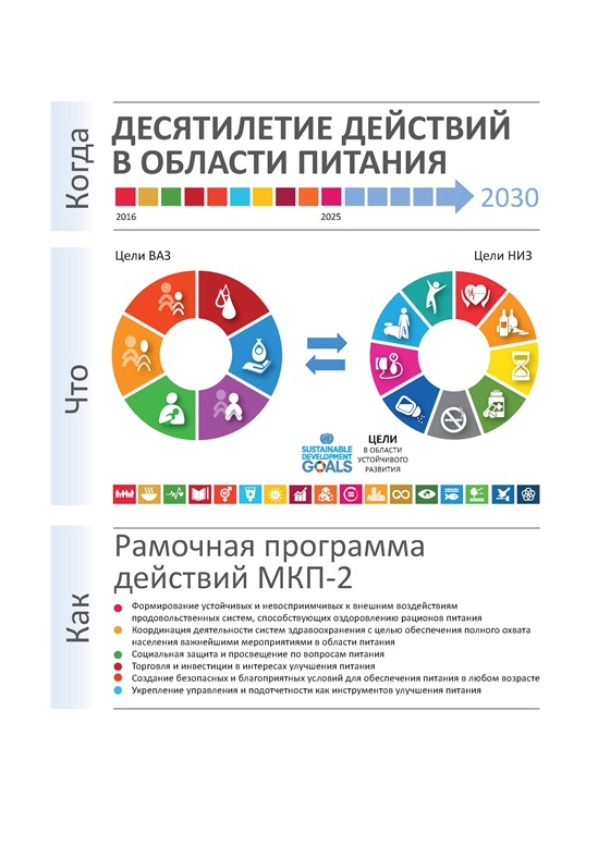 Эта работа ведется на основе Комплексного плана осуществления действий в области питания матерей и детей грудного и раннего возраста, который был принят государствами-членами на Всемирной ассамблее здравоохранения в 2012 г. Меры по ликвидации неполноценного питания имеют также решающее значение для достижения связанных с питанием целей Глобального плана действий по профилактике неинфекционных заболеваний и борьбе с ними на 2013–2030 гг., Глобальной стратегии охраны здоровья женщин, детей и подростков на 2016–2030 гг., рекомендаций, содержащихся в докладе Комиссии по ликвидации детского ожирения (2016 г.), и Повестки дня в области устойчивого развития на период до 2030 г.