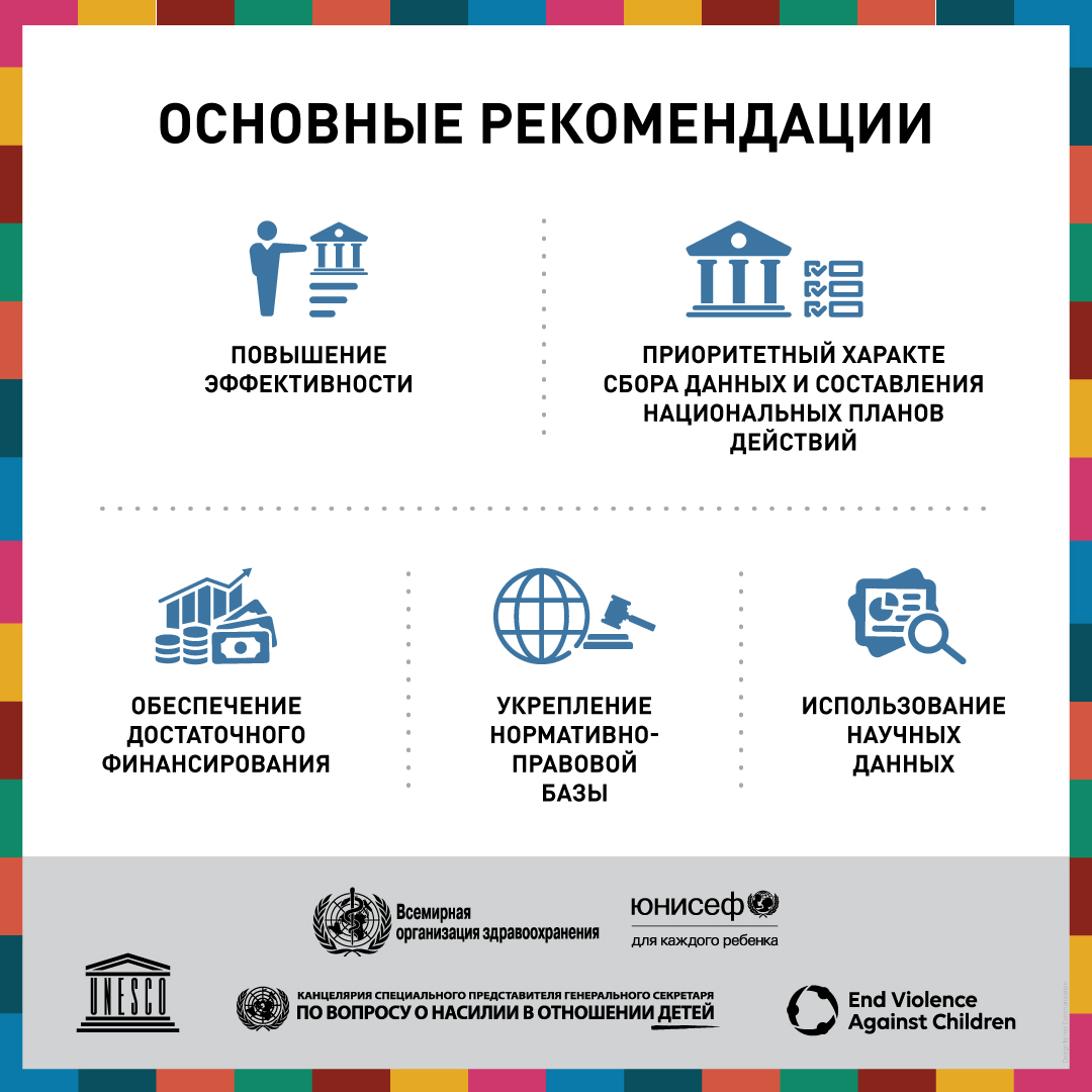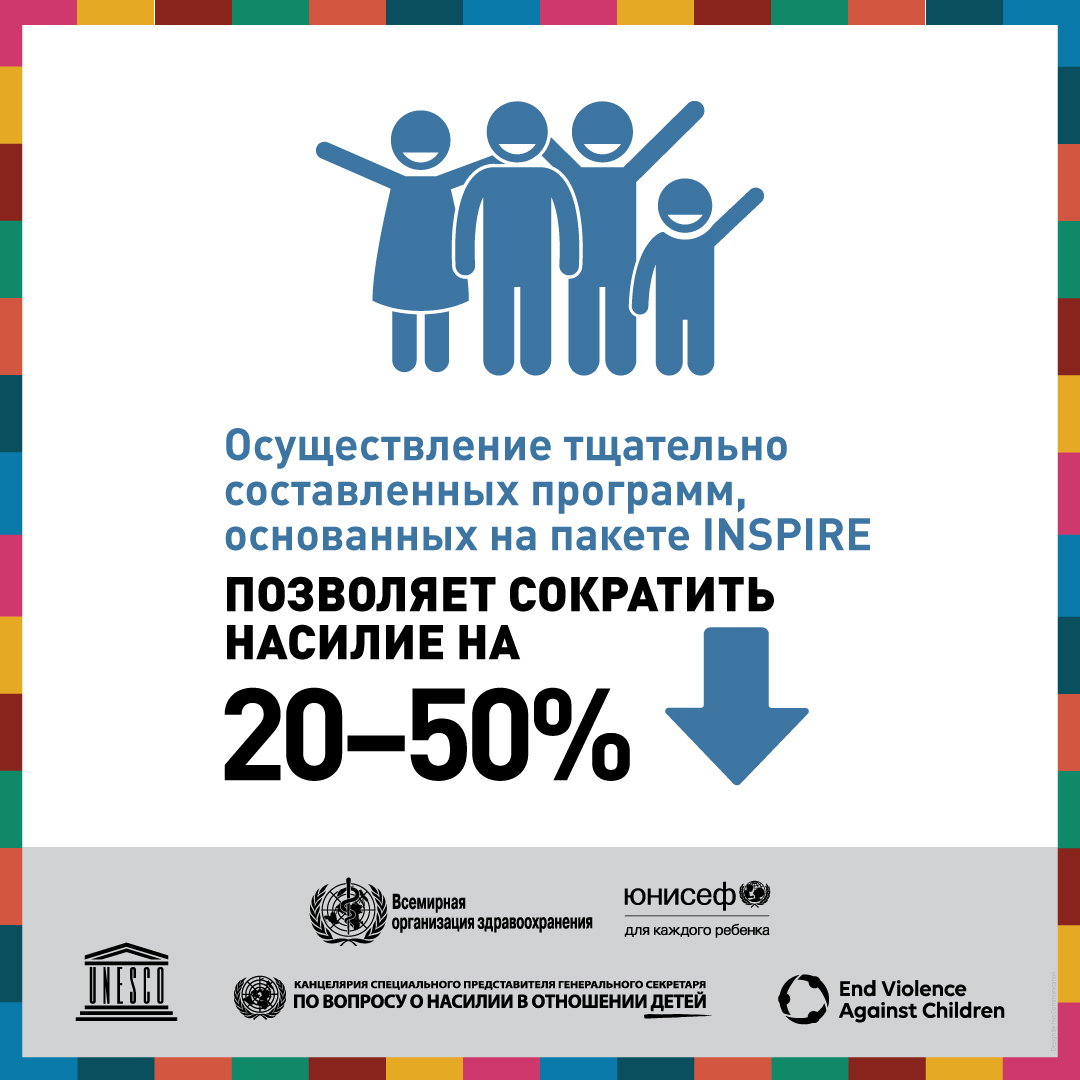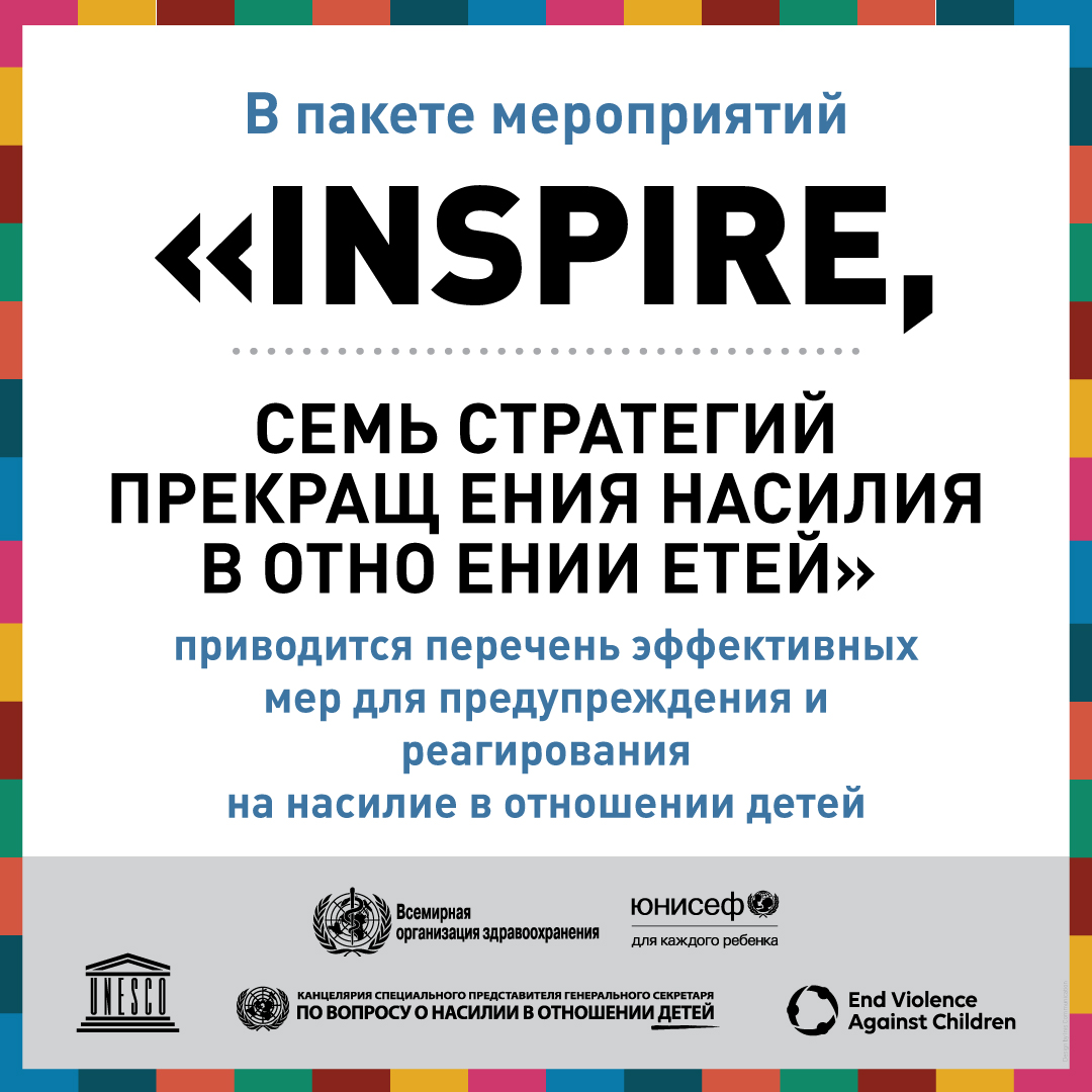 В «Глобальном докладе о положении дел в области предупреждения насилия в отношении детей за 2020 г.» приводится информация о прогрессе в достижении ЦУР, направленных на прекращение насилия в отношении детей, в странах. Совместная публикация ВОЗ, ЮНИСЕФ, ЮНЕСКО, Специального представителя Генерального секретаря ООН по вопросу о насилии в отношении детей и Глобального партнерства по прекращению насилия в отношении детей содержит информацию, полученную от более чем 1000 лиц, ответственных за принятие решений, в 155 странах мира, которые оценивали положение дел в области предупреждения насилия в своих странах с помощью научно обоснованных подходов, изложенных в сборнике «INSPIRE: Семь стратегий по ликвидации насилия в отношении детей». В докладе показано, что, хотя во многих странах, принимавших участие в этой работе, принимаются некоторые меры, официальные власти в этих странах признают, что предпринимаемых ими усилий явно недостаточно для выполнения задач, предусмотренных ЦУР. В докладе предлагаются рекомендации по активизации деятельности, направленной на осуществление стратегий INSPIRE в странах и ускорение прогресса в этой области.