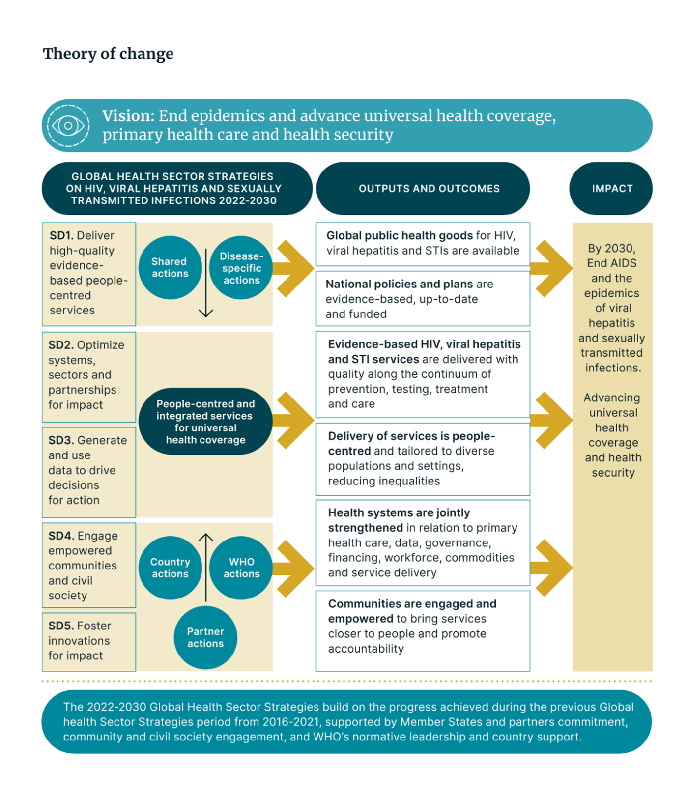 The new strategies propose a common vision to end epidemics and advance universal health coverage, primary health care and health security in a world where all people have access to high-quality, evidence-based and people-centred health services. The GHSS promote the disease-specific goals to end AIDS and the epidemics of viral hepatitis and sexually transmitted infections by 2030, with 5 strategic directions providing the overall guiding framework for achieving these goals.