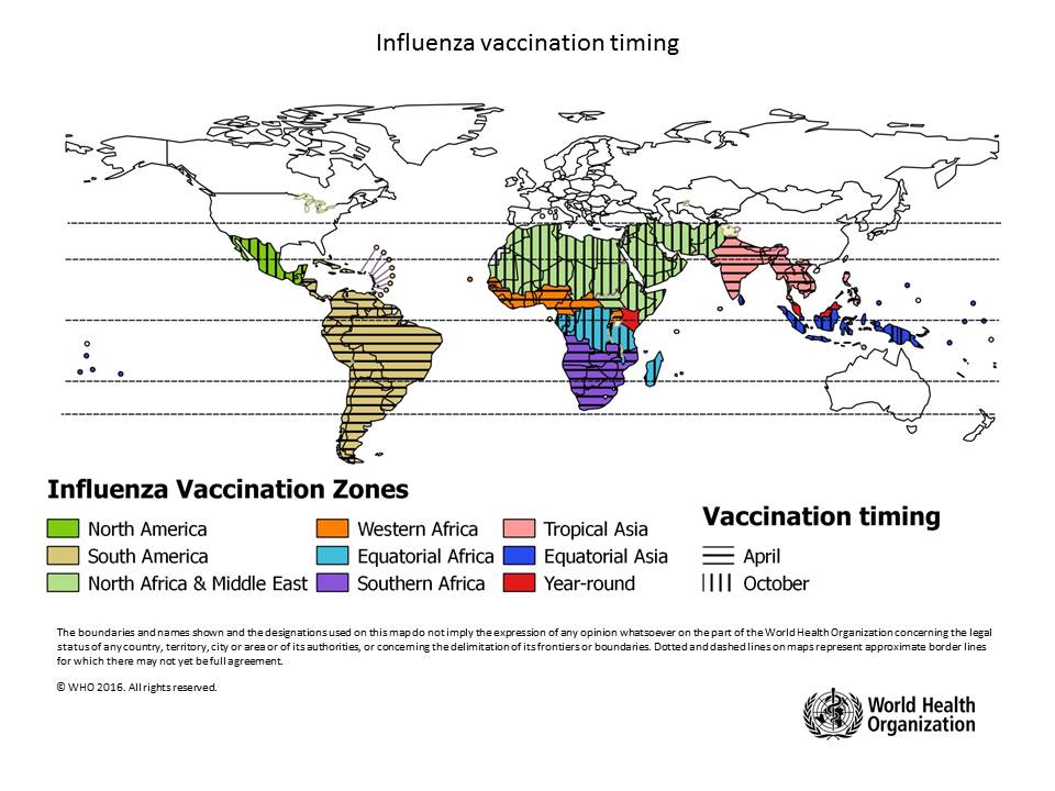 The WHO Global Influenza Program recommends an evidence-based practical approach to group countries that share the same seasonality pattern and virus antigenic characteristics, into Influenza Vaccination Zones to address the country needs.