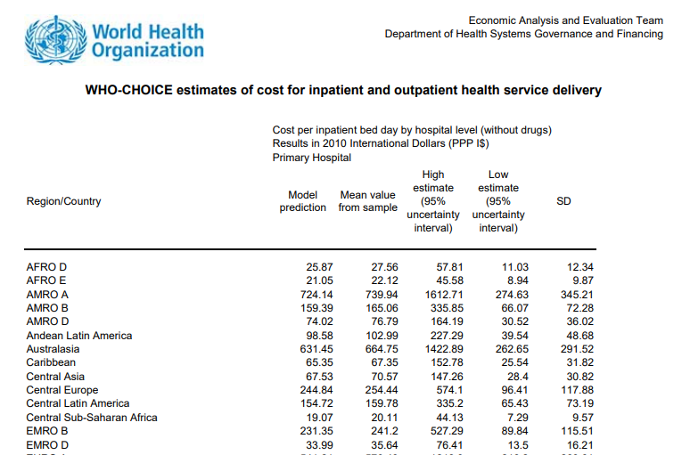 WHO also maintains estimates of unit costs of service delivery at the country and regional levels. Costs per outpatient visit and costs per hospital bed-day are presented and include all cost components, with the exception of drugs and diagnostics.
