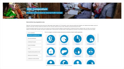 The UHC Compendium is a database of health services and intersectoral interventions designed to assist countries in making progress towards Universal Health Coverage (UHC). It provides a strategic way to organize and present information and creates a framework to think about health services and health interventions. The database for the Compendium spans the full spectrum of promotive, preventive, diagnostic, resuscitative, curative, rehabilitative, and palliative services, as well as a full complement of intersectoral interventions. The Compendium will provide rapid one-stop access to supporting evidence, associated human and material resource inputs, and feedback on cost impact as interventions are selected.
