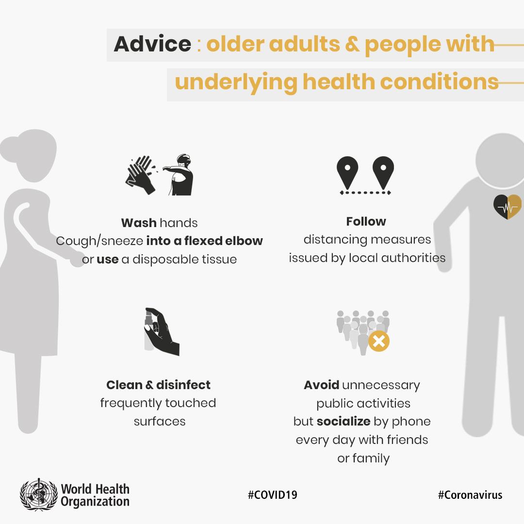 WHO guidance on "Mental health and psychosocial considerations during the COVID-19 outbreak" as part of risk communication and community engagement technical guidance for COVID-19 response. Includes detailed messages for older adults, people with underlying health conditions (e.g. dementia) and their carers .