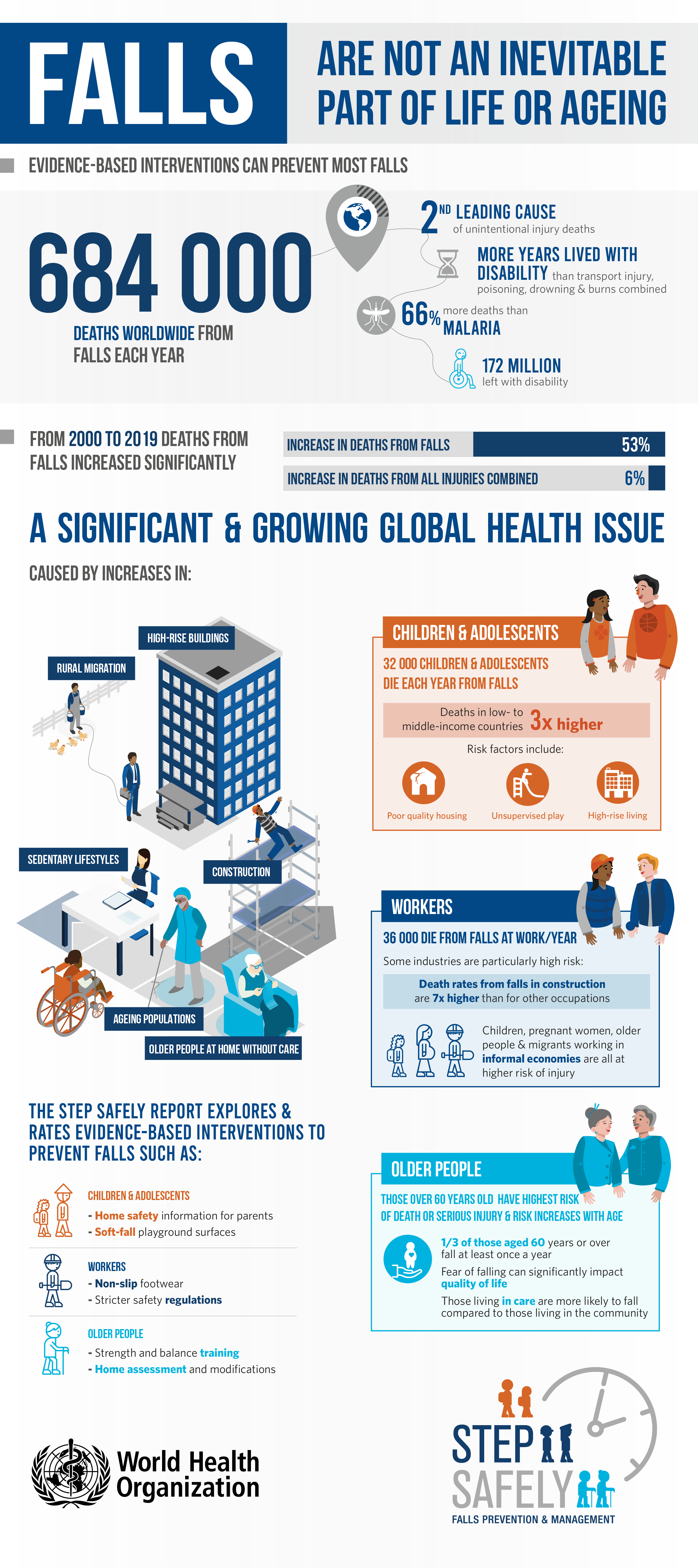Falls take the lives of 684 000 people each year. Beyond the death toll, 172 million more people experience disabilities arising from a fall each year. Falls are not only a significant global public health problem – they are a rapidly growing one. Fall-related deaths have risen far faster than any other type of injury over the last two decades. Many factors account for this increase – ageing populations and patterns of urbanization chief among them.
