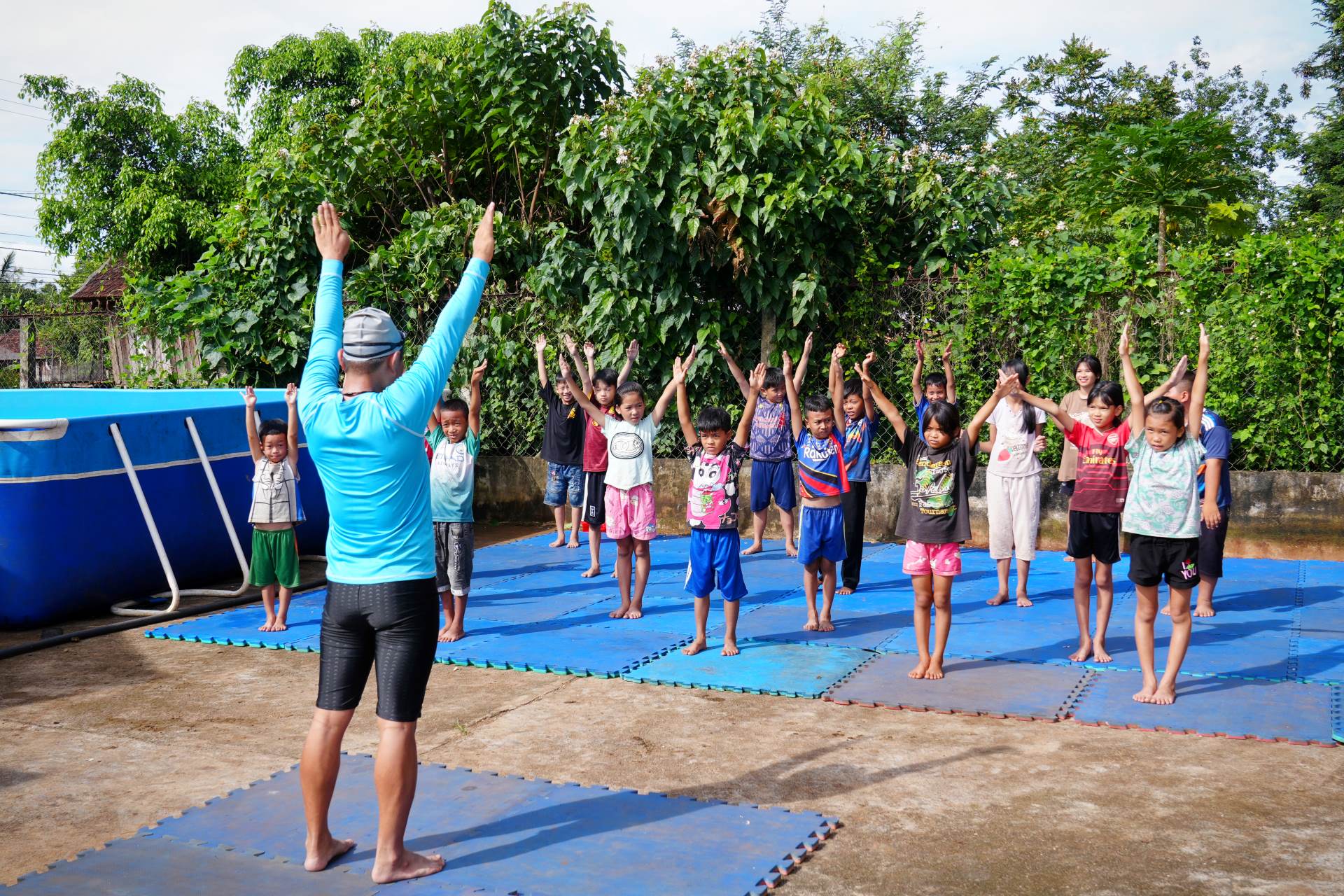 Anh Mai Văn Chuyền hướng dẫn các em học sinh khởi động trước khi vào bài học bơi. Ảnh: WHO/Ho Chi Cuong.