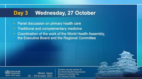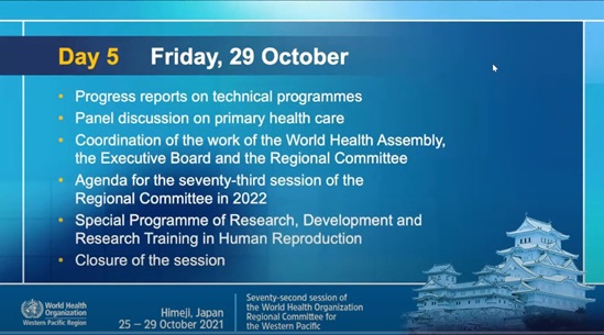 La Soixante-douzième session du Comité régional de l’Organisation mondiale de la Santé pour le Pacifique occidental s’est tenue à Himeji (Japon) du 25 au 29 octobre 2021.