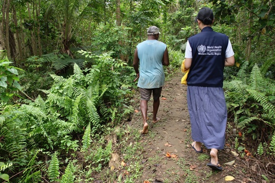 Samu showed the WHO team around the island he calls home. There are the houses of cousins, aunts and uncles; and family is buried at the island cemetery. Crossing through dense forest, on the other side of the island Samu shows us the erosion dramatically changing the coastline. In other parts of the island chain, huge channels of water cut through previously landlocked areas.