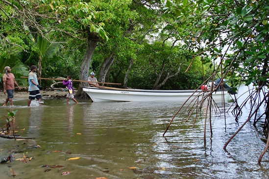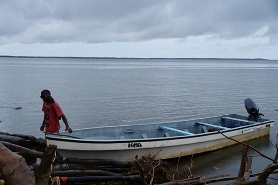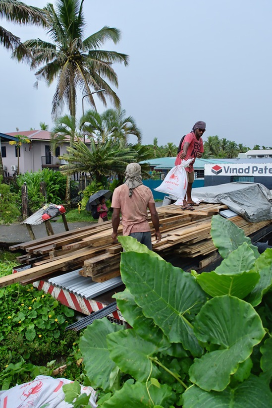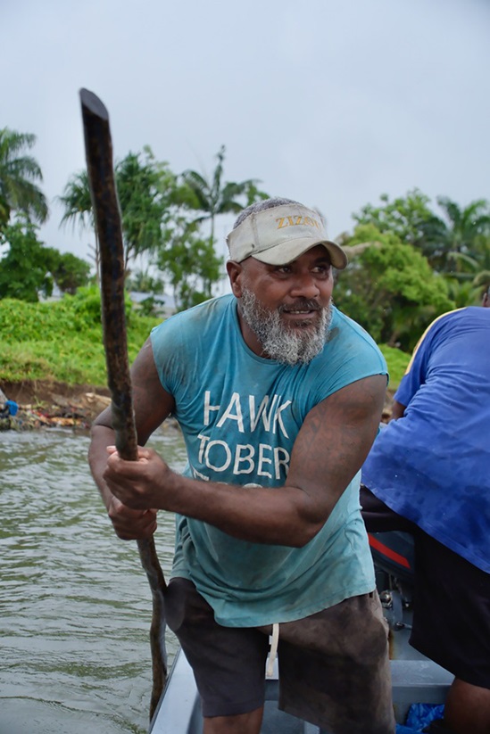 Samu Bakau pushes the fiberglass boat off from shore with a long-wooden stick. We are underway! The shallow boat is filled with long planks of wood, bags of cement, corrugated metal sheets, and plastic piping – building materials for extending the Laucala Village evacuation center. Situated on Laucala Island, the village lies 7 km across a bay, to the south of Suva, Fiji's capital city.