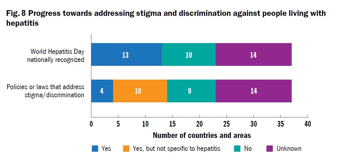 Stigma and discrimination potentially constitute a major barrier to accessing testing and treatment services and are not well understood in the Region. Only four countries had policies specifically addressing stigma and discrimination towards people living with hepatitis (Fig. 8). A systematic review of HBV stigma showed more research was needed as there was a lack of data in this area and limited recognition of this as a potentially major barrier in offering hepatitis services. Studies on people living with hepatitis in countries such as China and Viet Nam showed varying levels of stigma and discrimination, both perceived and experienced. A study was carried out in China to pilot a “discrimination index” to measure the experience of HBV discrimination adapted from the stigma index instrument developed by UNAIDS for assessing discrimination experienced by HIV/AIDS patients. This showed that 75% of respondents perceived or experienced discrimination by family, friends, colleagues, leaders or health-care workers because of their HBV infection. Less than 10% were aware of organizations or institutions that provide help to mitigate discrimination. Clearly more research is required to understand the experience of those living with hepatitis, and to evaluate interventions that could help mitigate the impact of stigma at individual, community and programme levels.