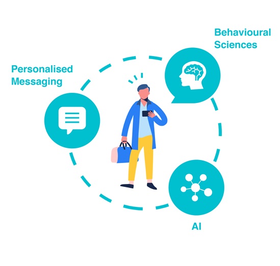NudgeAI is a hyper-personalised messaging agent powered by behavioural sciences and machine learning that encourages behaviour change at the individual level. Learning from data about people's behavioural patterns, NudgeAI creates targeted interventions to effectively change individuals' decisions and behaviours, while staying mindful and respectful of their freedom of choice.