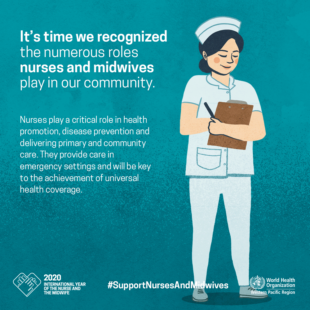 Comprising more than two-thirds of the health workforce in the WHO Western Pacific Region, nurses are critical in responding to health needs in all settings and across the lifespan. In the 2020 International Year of the Nurse and the Midwife, the World Health Day is an opportunity to highlight the work of nursing and midwifery around the world, while celebrating this workforce as one of the most valuable resources of every country.