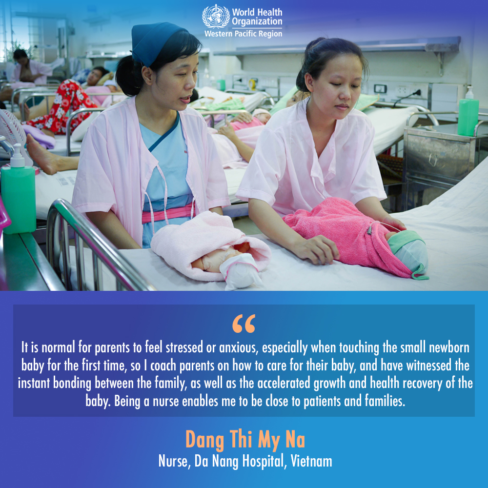 Among health workers, nurses and midwives spend the most time caring for and interacting with patients. They take on multiple roles, occasionally acting as life coaches and health advisers for patients and their families. Dang Thi My Na trains the parents of pre-term and low-birthweight babies on Kangaroo mother care (KMC). This technique involves keeping the babies skin-to-skin contact with their mother or other family members, exclusive breastfeeding, and close monitoring of danger signs and illnesses. KMC is recommended by WHO to improve preterm birth outcomes.