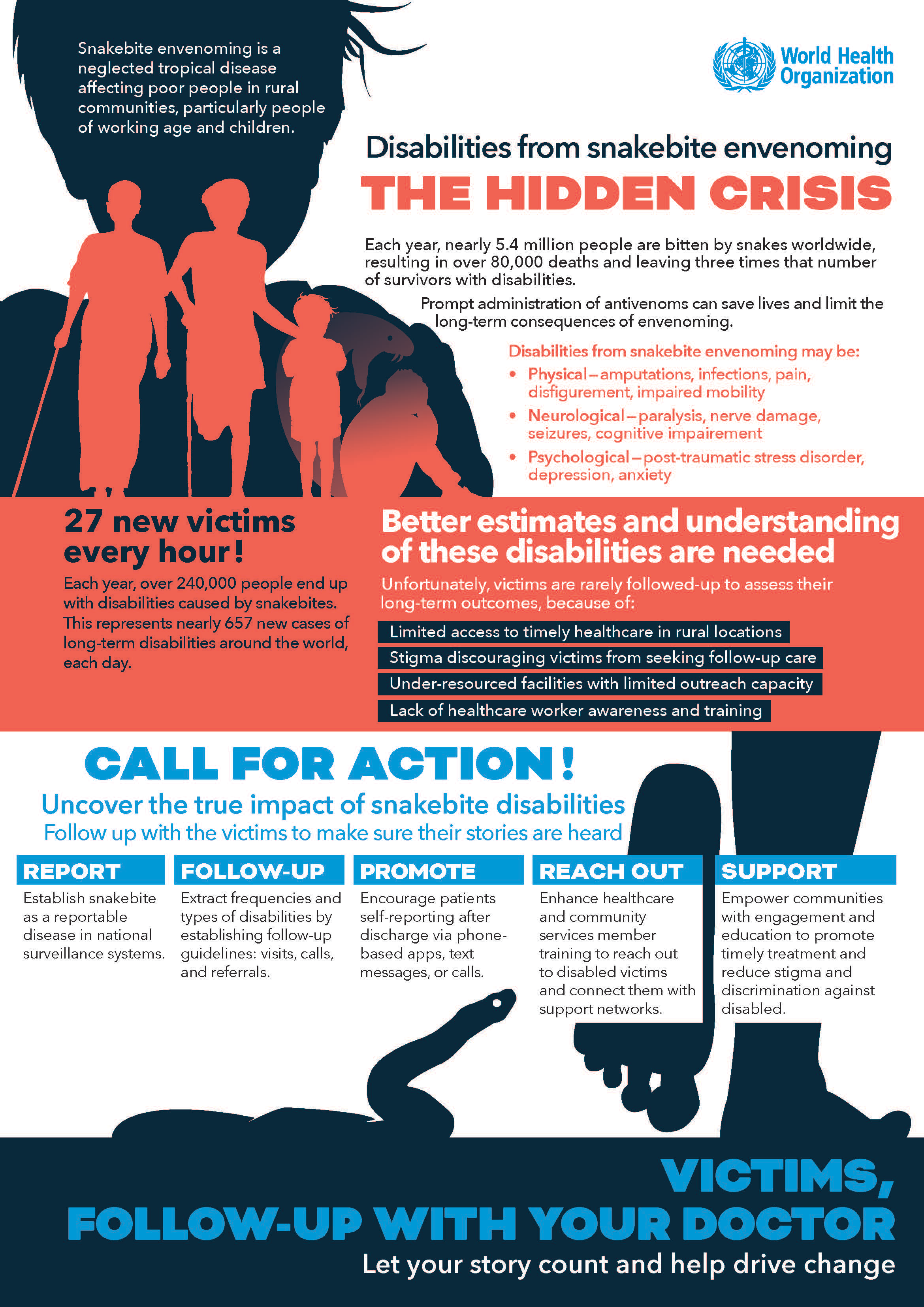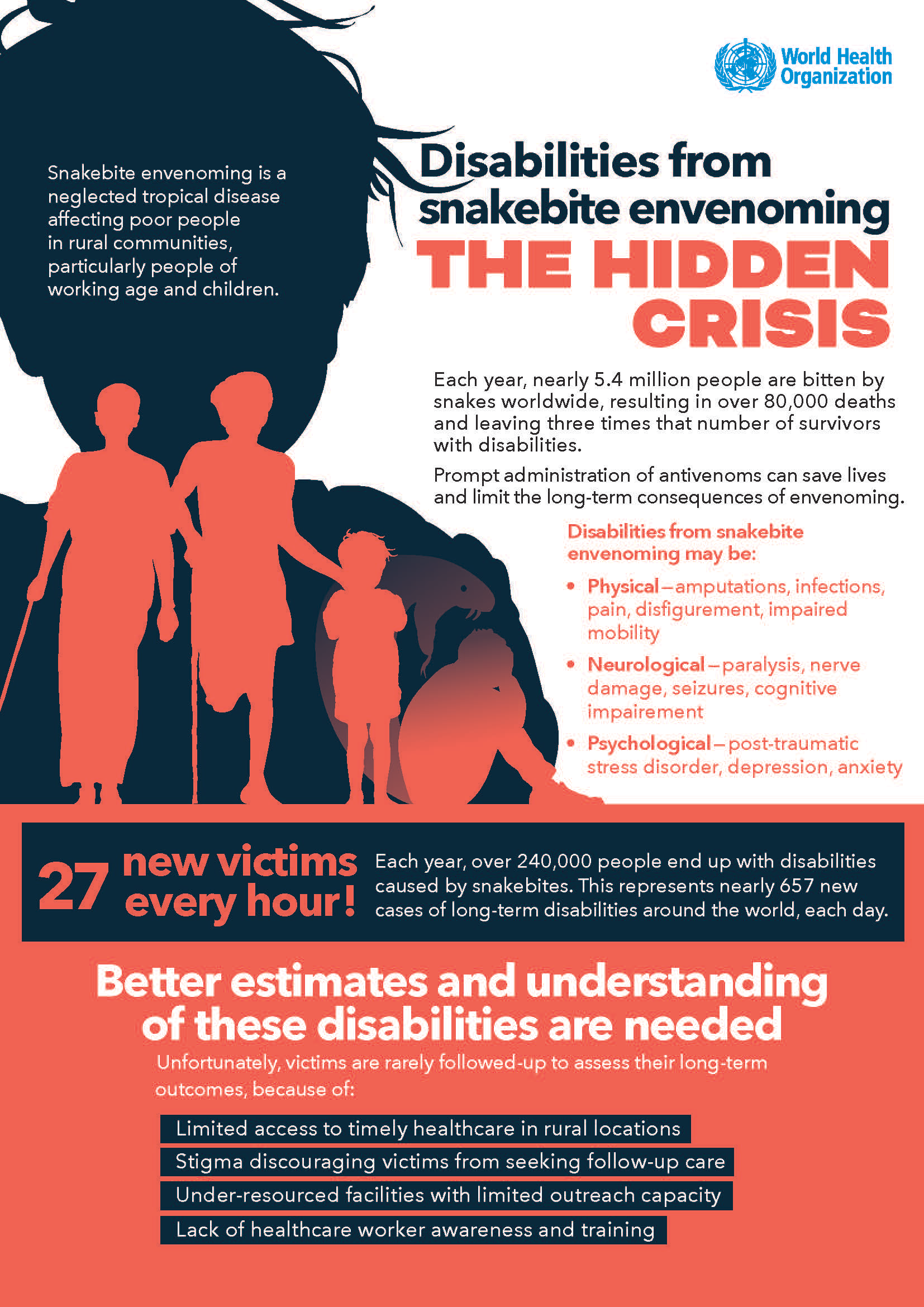 to improving access and equity for victims. Snake bites can cause a variety of disabilities potentially leading to substantial loss of limb use or even amputation. In some countries victims become mired in poverty and may be socially ostracized.