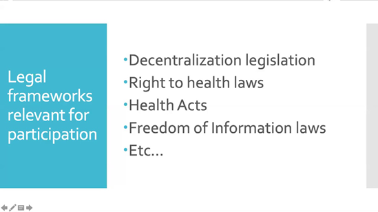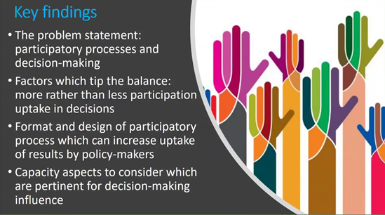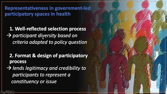 Governments increasingly recognize the need for more participatory and inclusive processes in health sector decision-making. National health policies, strategies and plans are more likely to be implemented effectively if their development and negotiation is inclusive of all relevant stakeholders. Engaging with the population, civil society and communities is also an important means to gauge expectations and opinions on health related-matters; this can contribute to responsive and people-centred health systems. Participatory governance thus entails bringing in the voice of end users of health services as well as the general population -- in essence, all those affected by health reforms.