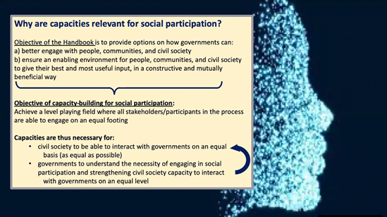 WHO provides technical support to countries in this area of work. It also contributes to the evidence base on how population engagement mechanisms can work, in which settings, and how. The Voice, agency, empowerment handbook on social participation for universal health coverage further serves as a guidance document to member states to strengthen systematic and meaningful government engagement with the population, civil society and communities by drawing from best practice examples to establish, set up and institutionalize such mechanisms in national policy, planning and review processes.