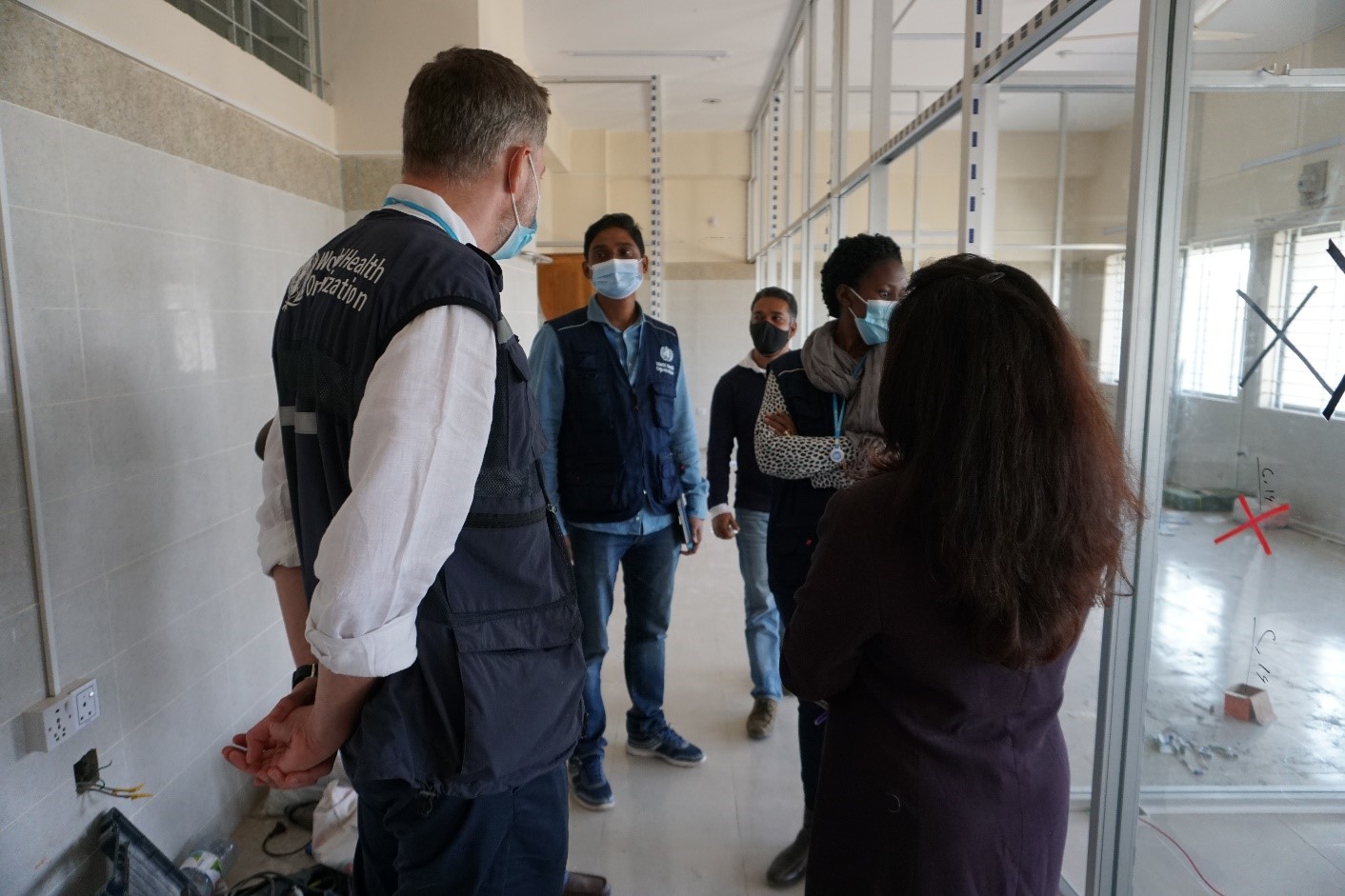WHO Head of Sub-Office Dr Kai von Harbou (on the left) at the expansion site of the IEDCR laboratory in January 2021. WHO Bangladesh/Tatiana Almeida