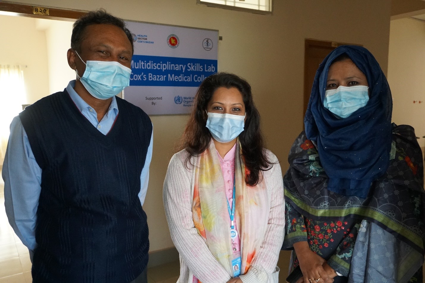 Left to right, Principal of Cox’s Bazar Medical College, Professor Dr Anupam Barua, Dr Moureen and Dr Sonia Afroz, Head of the Department of Microbiology, at the Multidisciplinary Skills Lab. WHO Bangladesh/Tatiana Almeida
