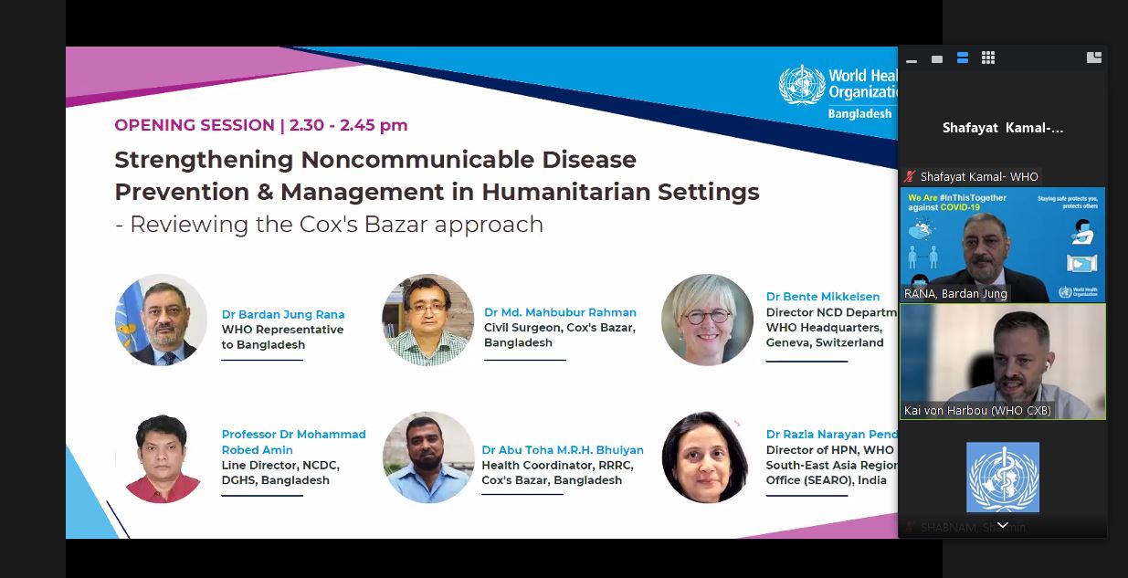 On 14 September 2021, WHO Bangladesh in coordination with the WHO Regional Office for South-East Asia (SEARO) and WHO Headquarters, held a webinar on “Strengthening Noncommunicable Disease Prevention & Management in Humanitarian Settings - Reviewing the Cox's Bazar approach”. Organized in close coordination with the Government of Bangladesh, the webinar provided a comprehensive review of NCD care delivery in the world’s largest refugee camp from community-based interventions up to primary health care facilities, while helping identify key common aspects that could be extrapolated to similar settlements around the world.