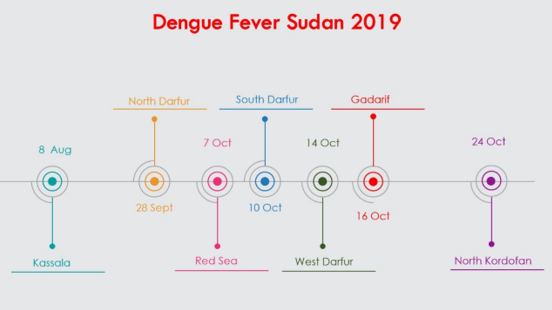 From 8 August through 4 November 2019, a total of 1,197 suspected cases of dengue fever including five deaths have been reported from seven states: Kassala (1,111 cases; 3 deaths), West Darfur (43 cases; 1 death), North Darfur (29 cases; 1 death), Red Sea (9 cases; 0 deaths), South Darfur (3 cases; 0 deaths), Gadarif (1 case; 0 deaths) and North Kordofan (1 case; 0 deaths).