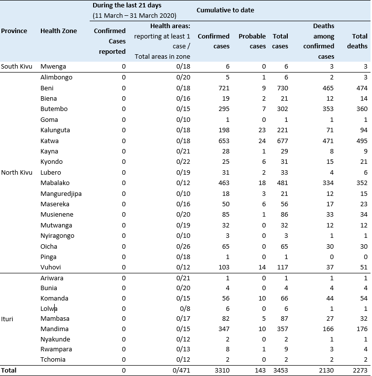 As of 31 March 2020, a total of 3453 EVD cases were reported from 29 health zones (Table 1), including 3310 confirmed and 143 probable cases, of which 2273 cases died (overall case fatality ratio 66%). Of the total confirmed and probable cases, 56% (n=1935) were female, 28% (n=979) were children aged less than 18 years, and 5% (n=171) were health care workers.