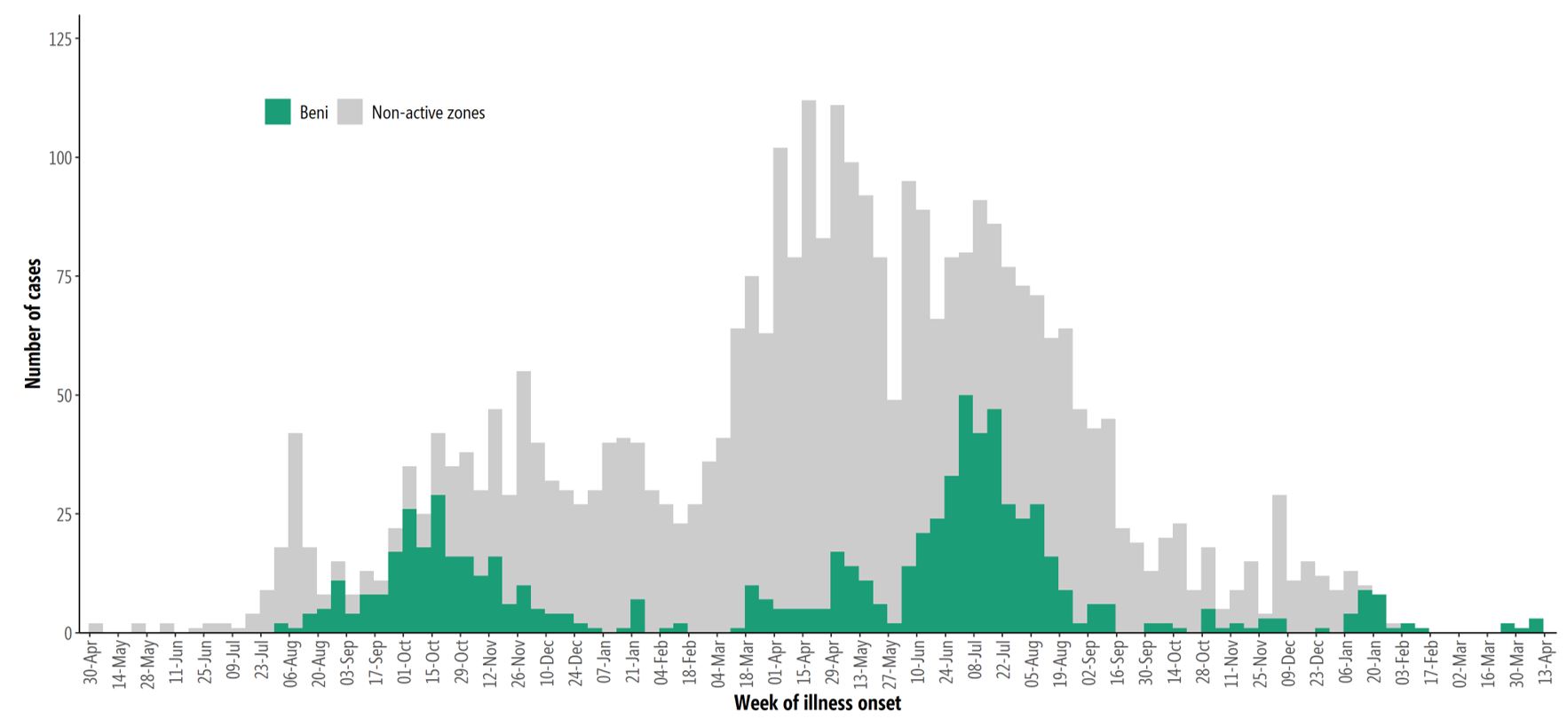 Prior to the emergence of this cluster in Beni, the last person confirmed to have EVD tested negative twice and was discharged from a treatment centre on 3 March 2020. As of 21 April, a total of 762 contacts of these cases have been registered, of which 603 (79%) were followed.