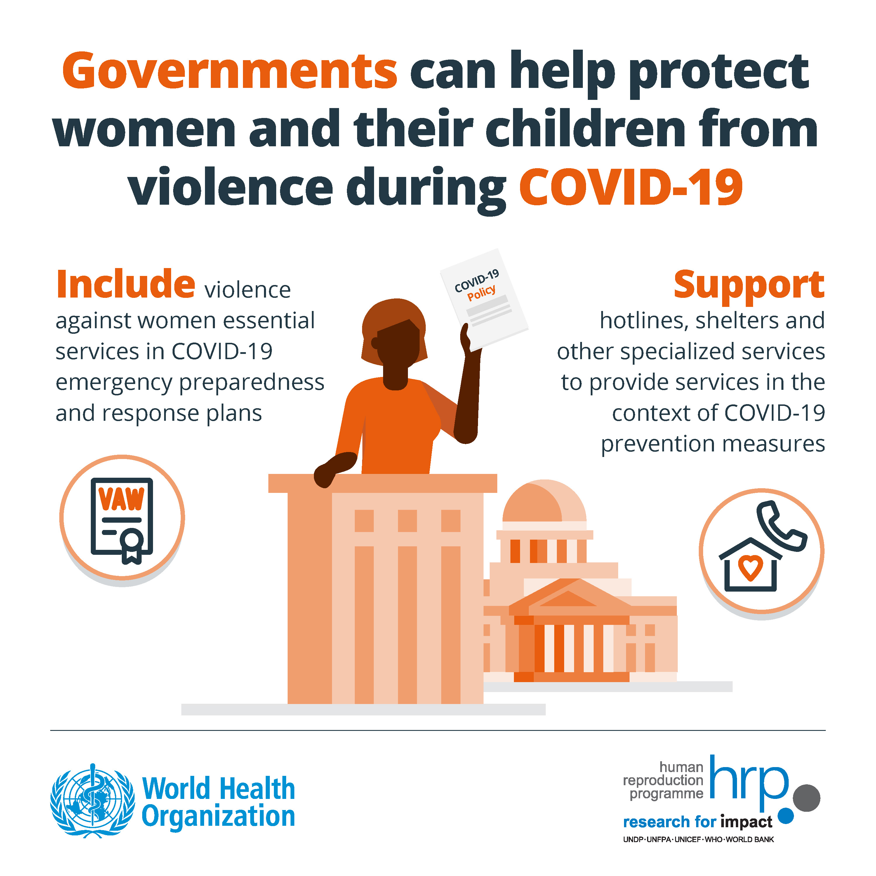 This document brings attention to the different ways in which the COVID-19 pandemic and measures to address it, such as staying at home, may exacerbate the risk of domestic violence against women. It highlights the importance of ensuring that support and medical care services for women and children affected by such violence are maintained and what health providers/services can do, including through identifying and offering referral options. It provides recommendations on what measures governments, health providers, community members and others can take to mitigate such violence and its impacts. It also provides tips for coping with stress at home and actions women who are experiencing violence or their family members can take.