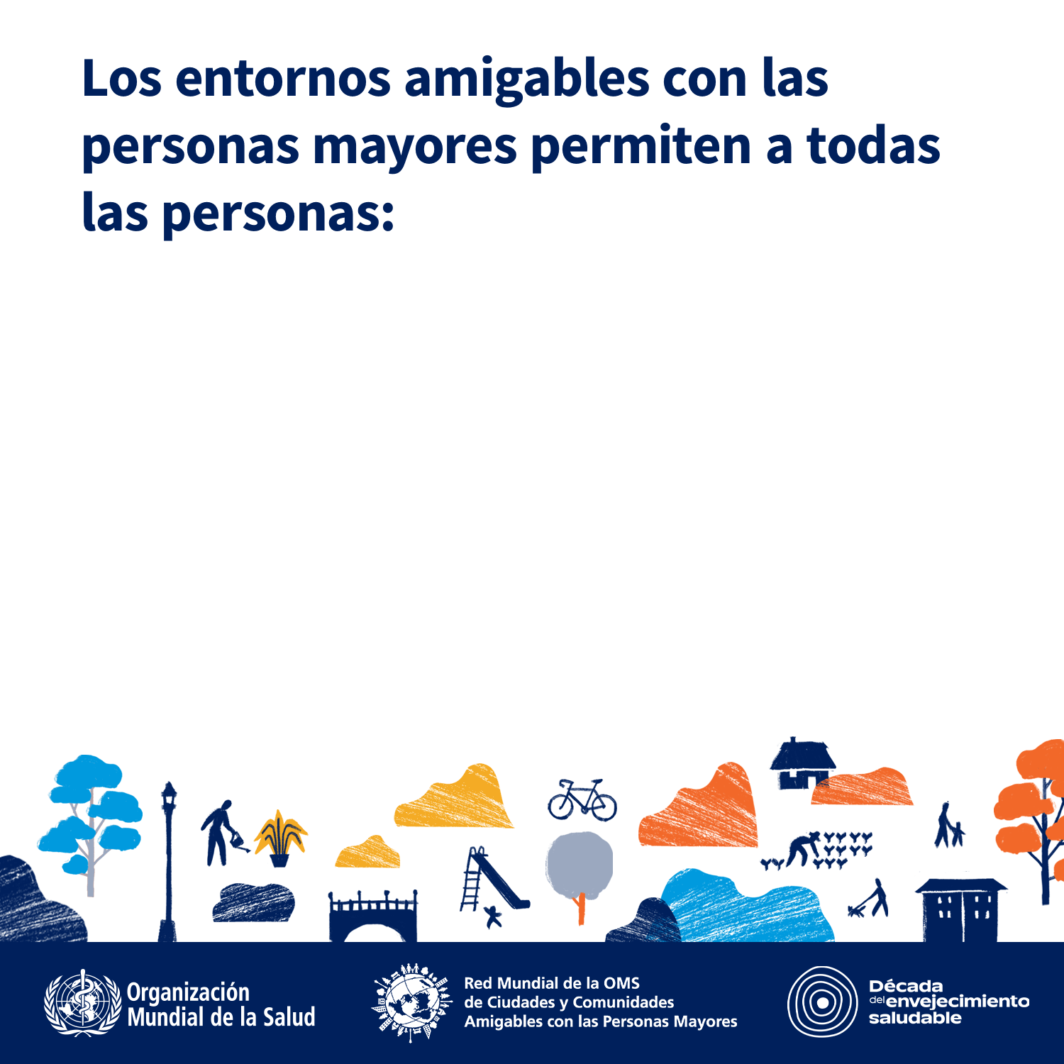 Nuestros entornos físicos y sociales son una gran influencia en la manera que experimentamos el envejecimiento y las oportunidades que trae. La creación de entornos amigables con las personas mayores permite a todas las personas envejecer bien en un lugar adecuado para ellas, continuar desarrollándose personalmente, ser incluidas y contribuir a sus comunidades, permitiendo al mismo tiempo su independencia y salud.