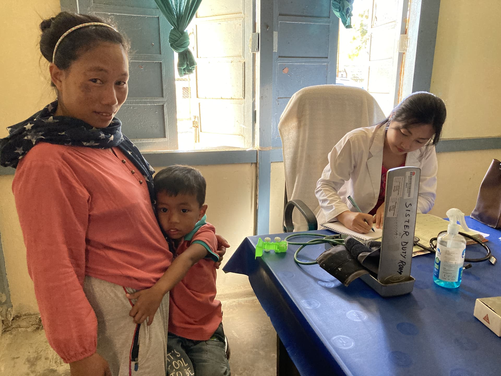 Dr Kobton Mossang, general duties medical officer, with a pregnant woman and her son at PHC Nampong, Changlang district, Arunachal Pradesh (Photo: Sanchita Sharma / © WHO India)