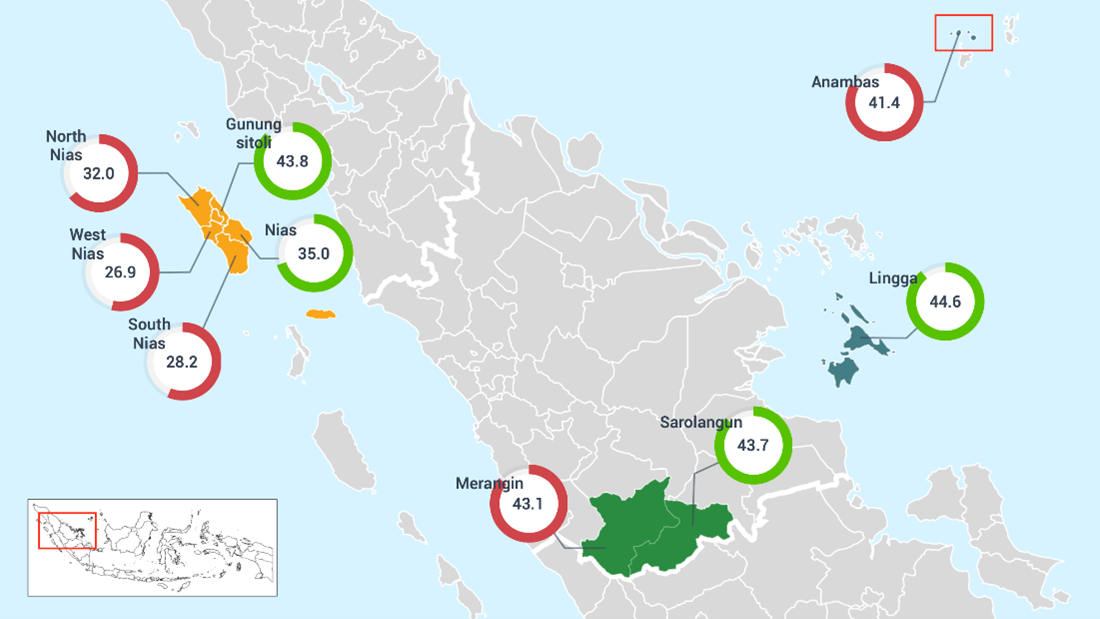 Figure 1: Target districts and provinces in Sumatra with assessment scores for malaria elimination readiness as of July 2023.