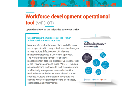 FAO, WHO and WOAH have developed and piloted the "Workforce development for effective management of zoonotic diseases" Operational Tool (WFD OT) of the Tripartite Zoonoses Guide to support countries in planning and strengthening a multisectoral workforce for effective zoonotic disease management. This comprehensive guide provides practical steps, resources, and tools to enhance your workforce's capabilities. Outputs of the tool are integrated into existing workforce plans for these to be financed, coordinated, and implemented.