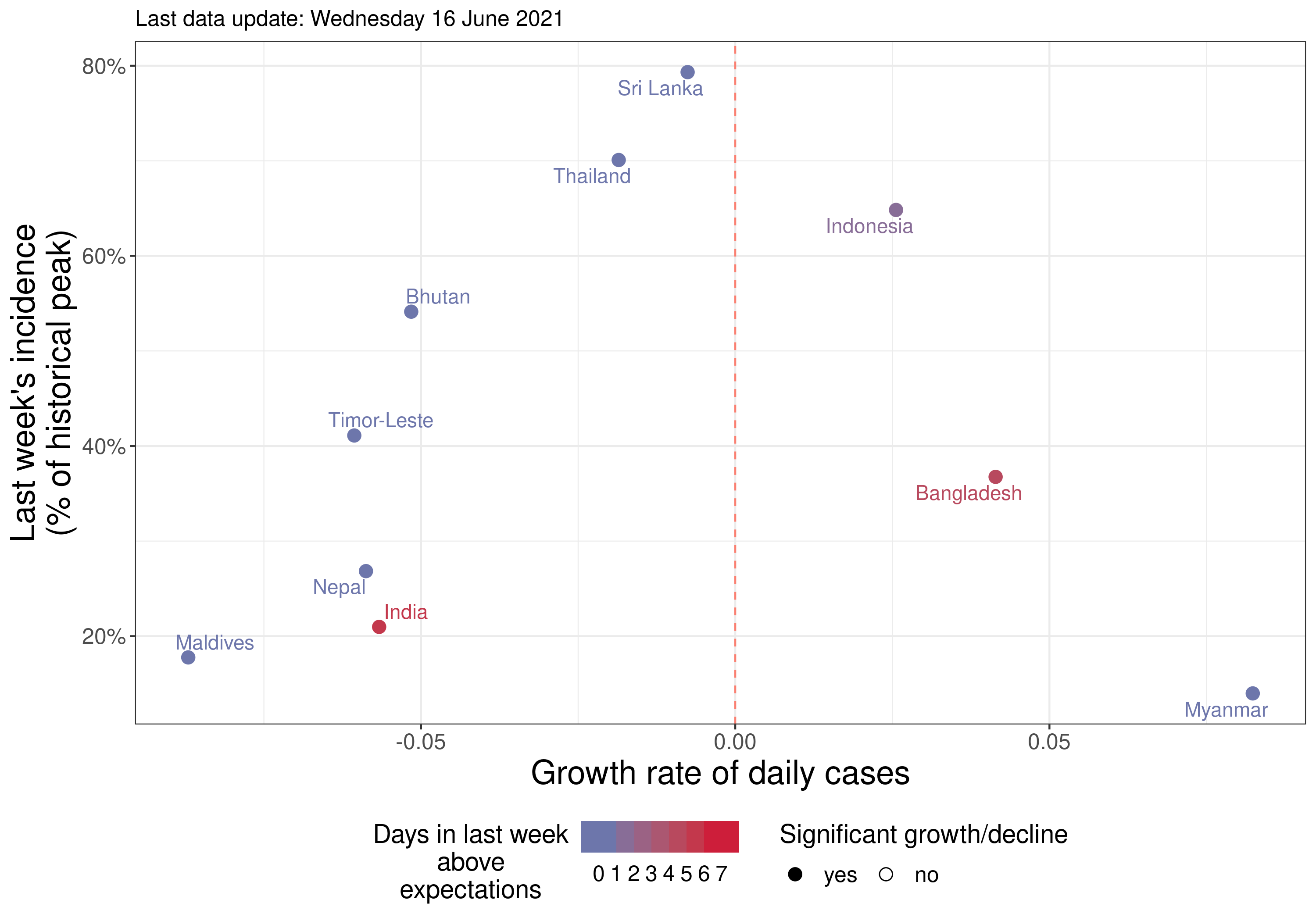Finally, the colour of each point represents the number of recent days that the trend exceeded what was expected. The more red a point is, the longer has been the “acceleration” beyond what was expected.