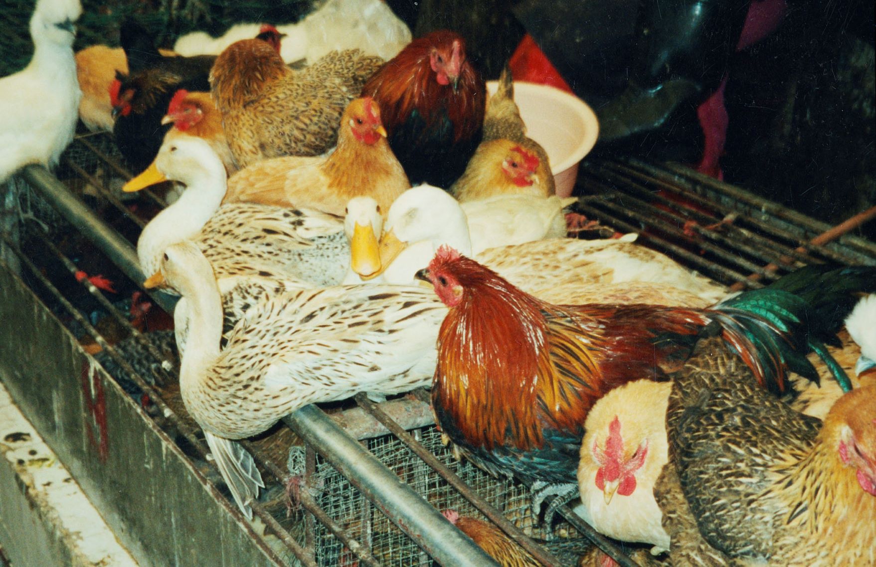 Live bird market in Hong Kong, chickens and ducks together on top of a cage.