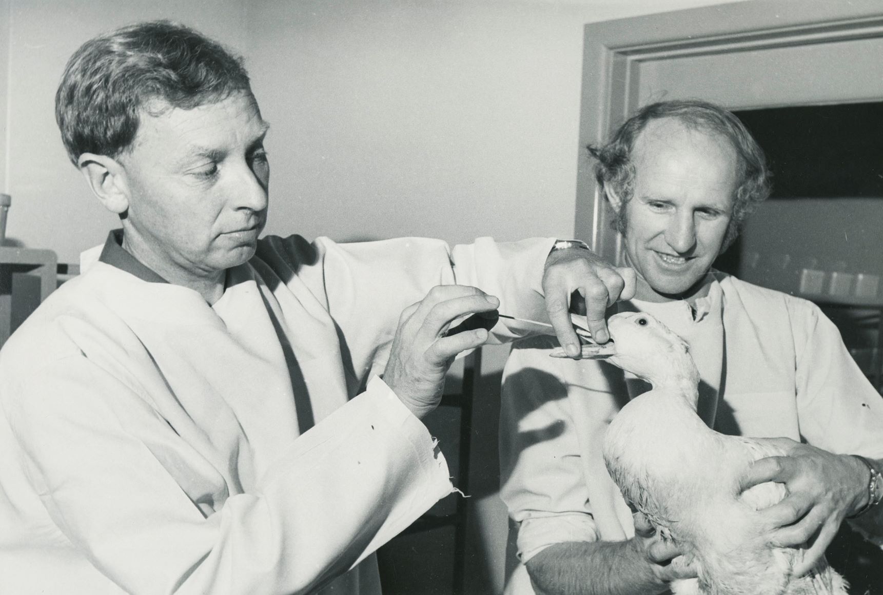 “The wrong end of the duck”. For many years Graeme Laver (left) and Rob Webster (right) swabbed the upper respiratory tract of birds for influenza.