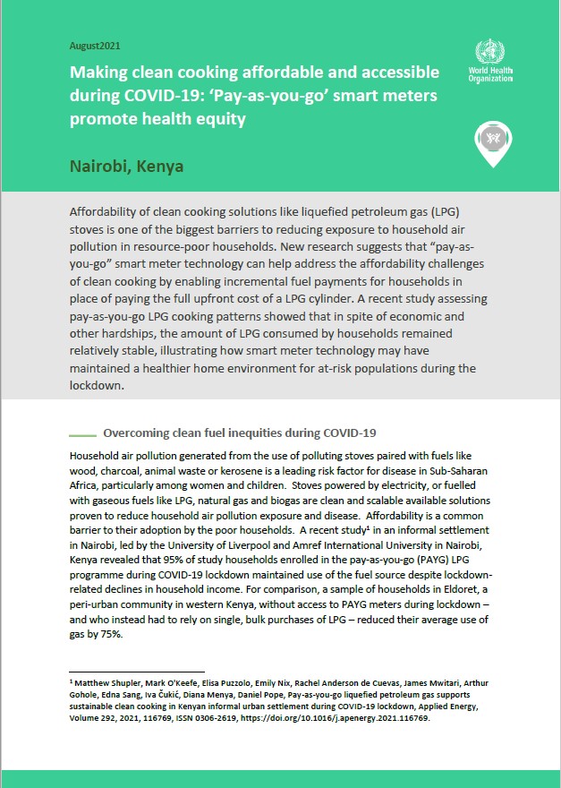 Household air pollution generated from the use of polluting stoves paired with fuels like wood, charcoal, animal waste or kerosene is a leading risk factor for disease in Sub-Saharan Africa, particularly among women and children. Stoves powered by electricity, or fuelled with gaseous fuels like LPG, natural gas and biogas are clean and scalable available solutions proven to reduce household air pollution exposure and disease. Affordability is a common barrier to their adoption by the poor households. A recent study1 in an informal settlement in Nairobi, led by the University of Liverpool and Amref International University in Nairobi, Kenya revealed that 95% of study households enrolled in the pay-as-you-go (PAYG) LPG programme during COVID-19 lockdown maintained use of the fuel source despite lockdown-related declines in household income. For comparison, a sample of households in Eldoret, a peri-urban community in western Kenya, without access to PAYG meters during lockdown – and who instead had to rely on single, bulk purchases of LPG – reduced their average use of gas by 75%.