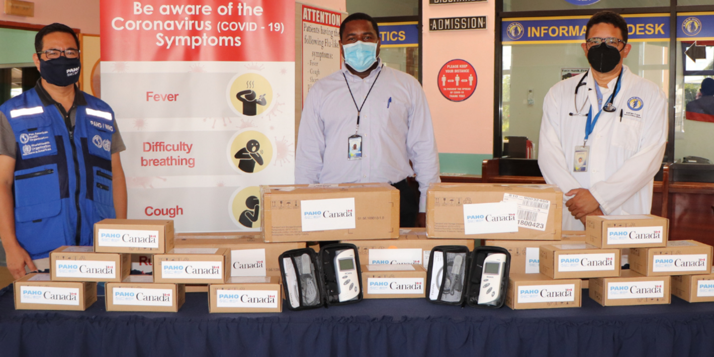 The WHO Regional Office for the Americas and the Government of Canada recently donated 25 portable hand-held pulse oximeters to the Karl Heusner Memorial Hospital's COVID-19 Unit in Belize. The unit is the only public facility in the country providing critical care services for COVID-19 patients.