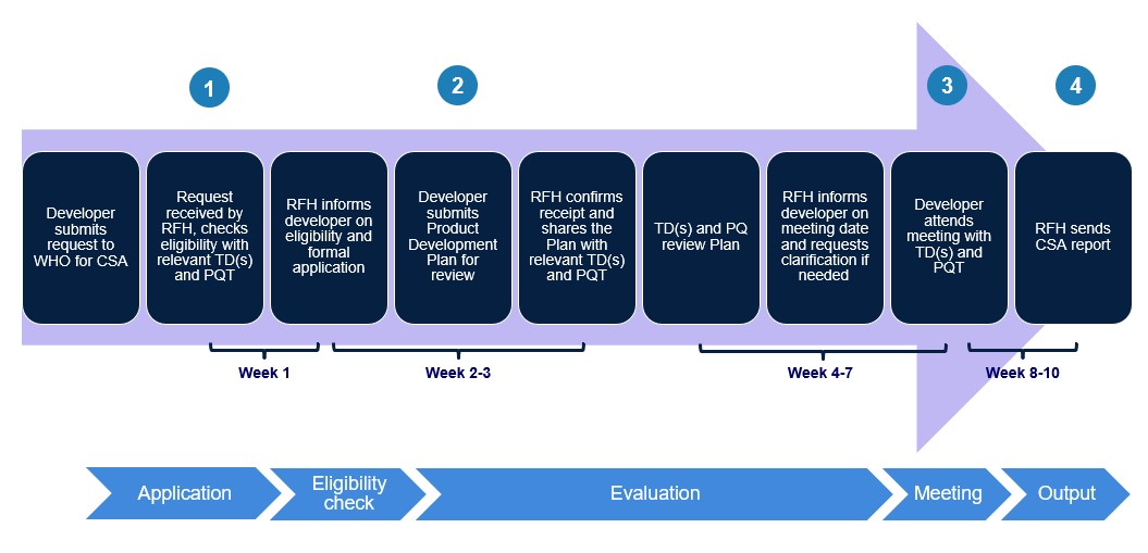 The timeline for the CSA procedure may vary depending on the submission received from the product developer, the nature of the product, its stage of development and the expected advice from WHO. However, the process is expected to take approximately ten weeks from the moment a request is received.