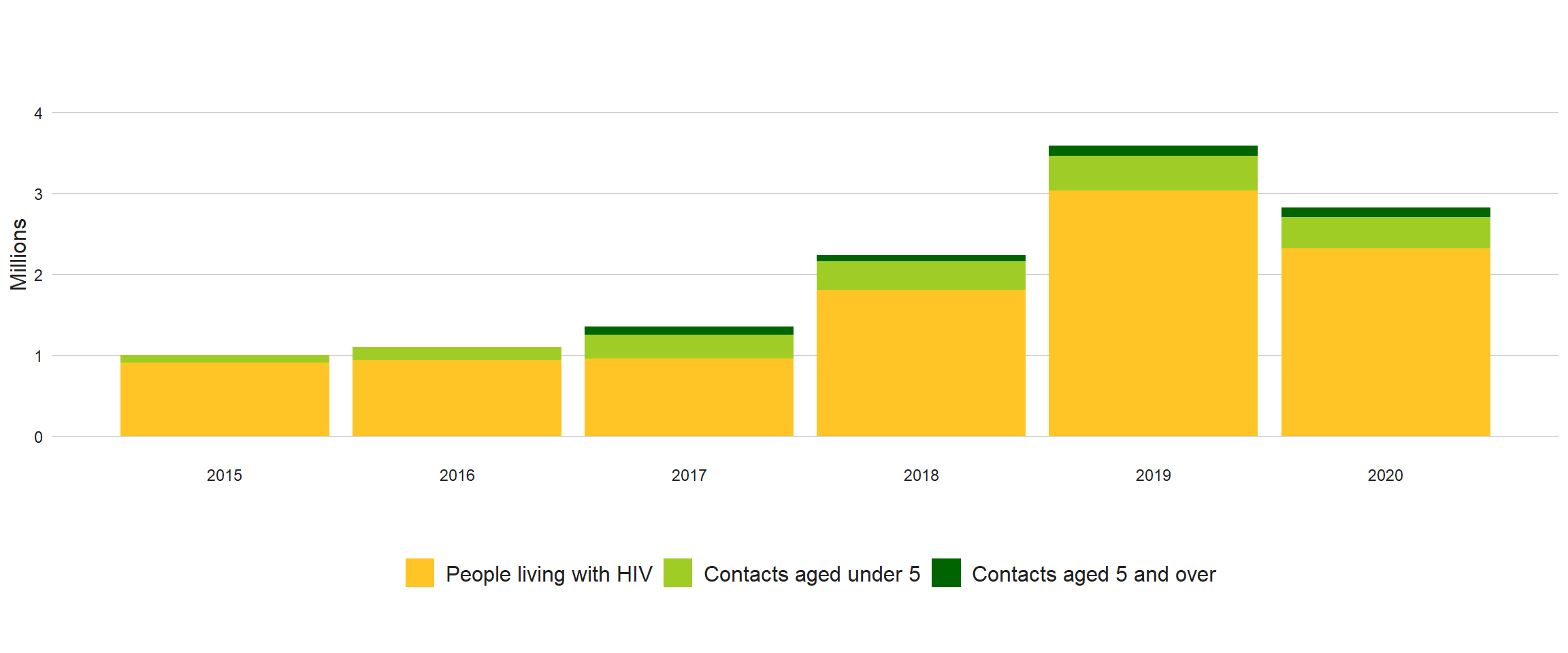 Provision of TB preventive treatment to household contacts increased between 2015 and 2019 (Fig. 4.1) but fell from 0.56 million in 2019 to 0.50 million in 2020 (a reduction of 11%). The cumulative number of contacts initiated on TB preventive treatment in the 3-year period 2018–2020, at 1.5 million, is only 6.2% of the target of 24 million for the 5-year period 2018–2022. This number included 1.2 million children aged under 5 years (29% of the 5-year target of 4 million) and 0.32 million people in older age groups (1.6% of the 5-year target of 20 million) (Fig. 4.2).