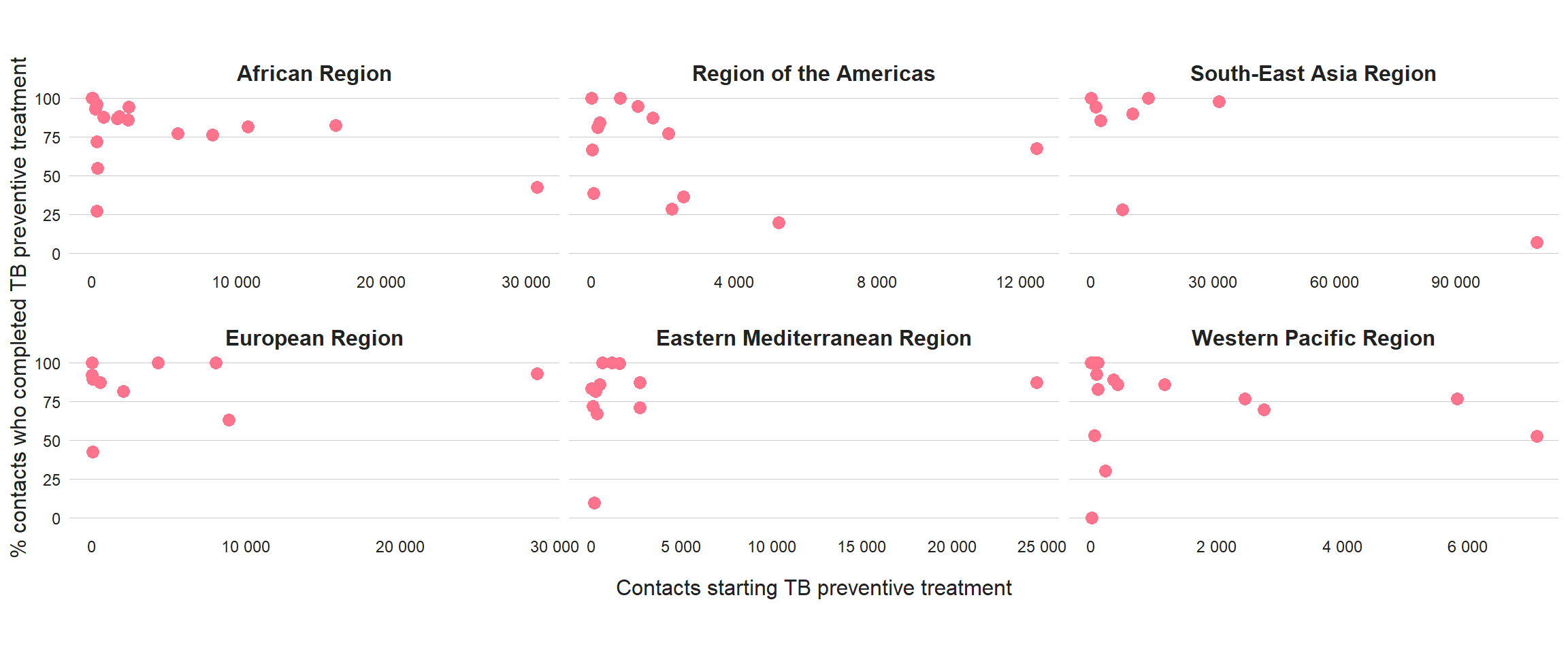 Globally in 2020, 7.0 million contacts of bacteriologically confirmed pulmonary TB cases were reported, of whom 3.9 million (55%) were evaluated for both TB infection and disease. These numbers were decreases (of 29% and 31%, respectively) from the 9.8 million reported and 5.6 million evaluated in 2019. Coverage of screening and initiation of TB preventive treatment varied widely among countries (Fig. 4.3, Fig. 4.4). There was also considerable variation in treatment completion rates. For the first time this year, countries reported TB preventive treatment completion data: among household contacts starting TB preventive treatment in 2019, the median completion rate was 86% (IQR, 71–96%) in 80 countries (Fig. 4.5).