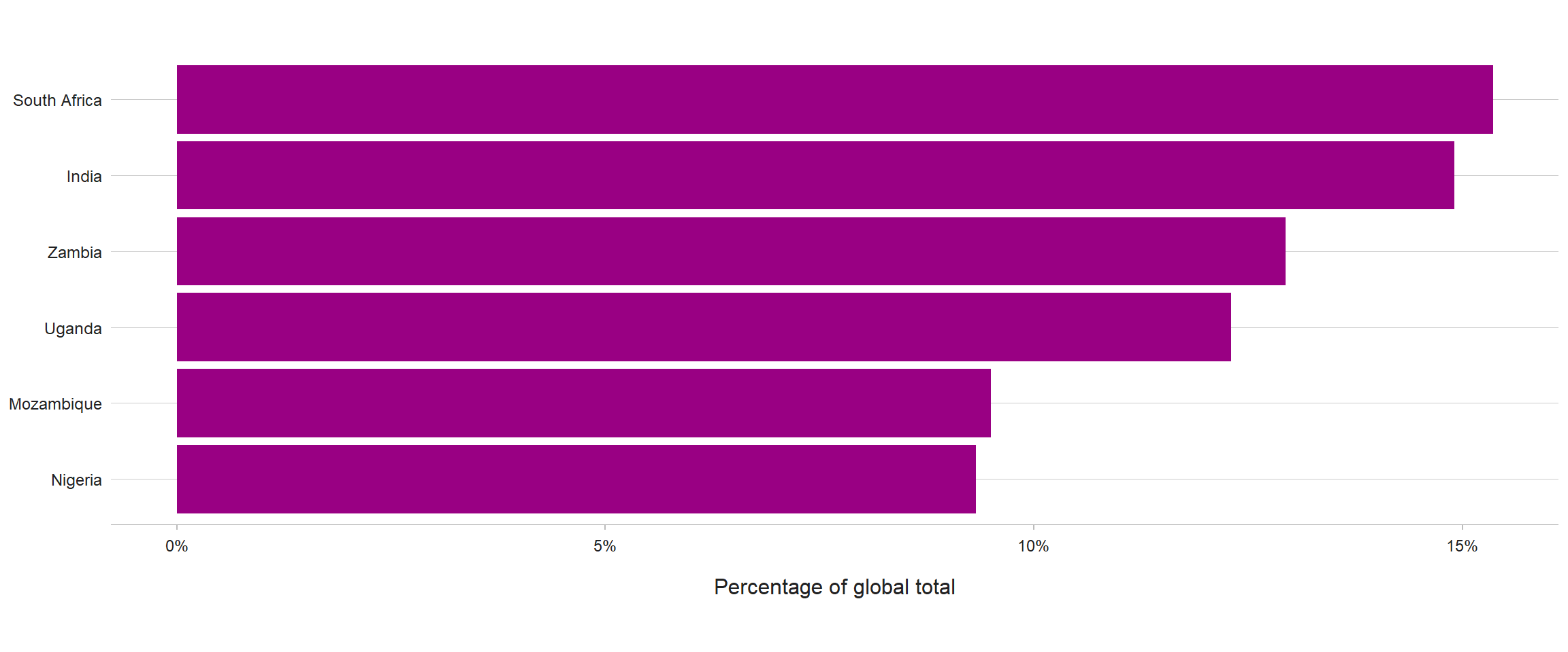 Most of those provided with TB preventive treatment to date have been people living with HIV (Fig. 4.1). Globally, the annual number increased from fewer than 30 000 in 2005 to 3.0 million in 2019, before falling to 2.3 million in 2020, a reduction of 23% compared with 2019 (Fig. 4.6). There were reductions in most WHO regions between 2019 and 2020. Six countries - India, Mozambique, Nigeria, South Africa, Uganda and Zambia - each reported initiating over 200 000 people with HIV on TB preventive treatment in 2020, accounting collectively for 74% of the 2.3 million reported globally (Fig. 4.7). Between 2018 and 2020, 7.2 million people with HIV received TB preventive treatment, meaning that the UN high-level meeting target of 6 million has been achieved well ahead of schedule. This represents a milestone achievement. However, accelerated scale-up will be needed to meet the implementation target of 90% by 2025, set out in the End TB Strategy and reaffirmed at the 2021 UN high-level Meeting on HIV and AIDS.
