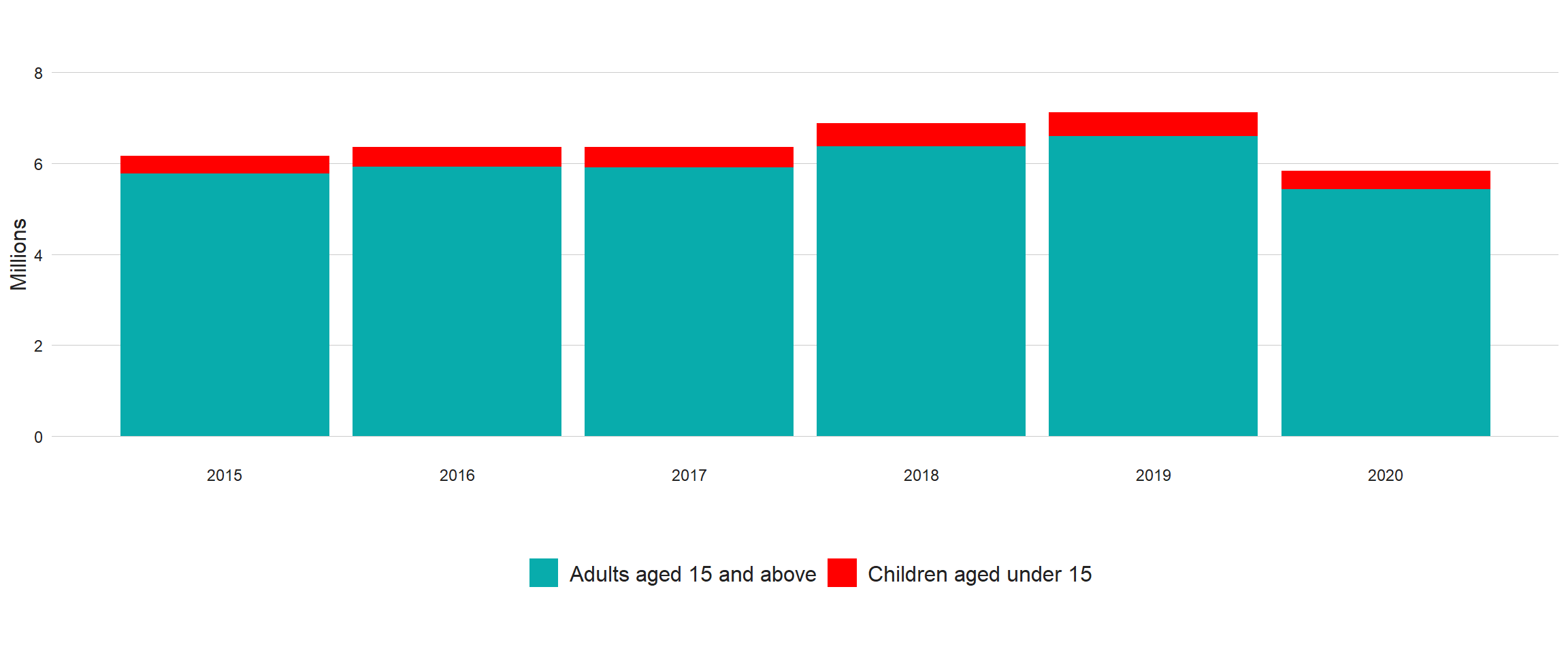 Most notified cases are among adults (Fig. 3.1.4), with more of those cases among men than women (Fig. 3.1.5). Of the global total of new and relapse TB cases notified in 2020, 58% were men, 35% were women and 7% were children (aged <15 years). A total of 1.4 million children were diagnosed and notified from 2018 to 2020, only 41% of the 5-year global target (for 2018–2022) of 3.5 million (Fig. 3.1.3). Between 2019 and 2020, there was a 24% decrease in notifications of TB cases among children, from 523 820 to 399 107. The global male:female (M:F) ratio for notifications in 2020 was 1.6, but ranged across WHO regions from 1.1 (WHO Eastern Mediterranean Region) to 2.0 (Western Pacific Region).