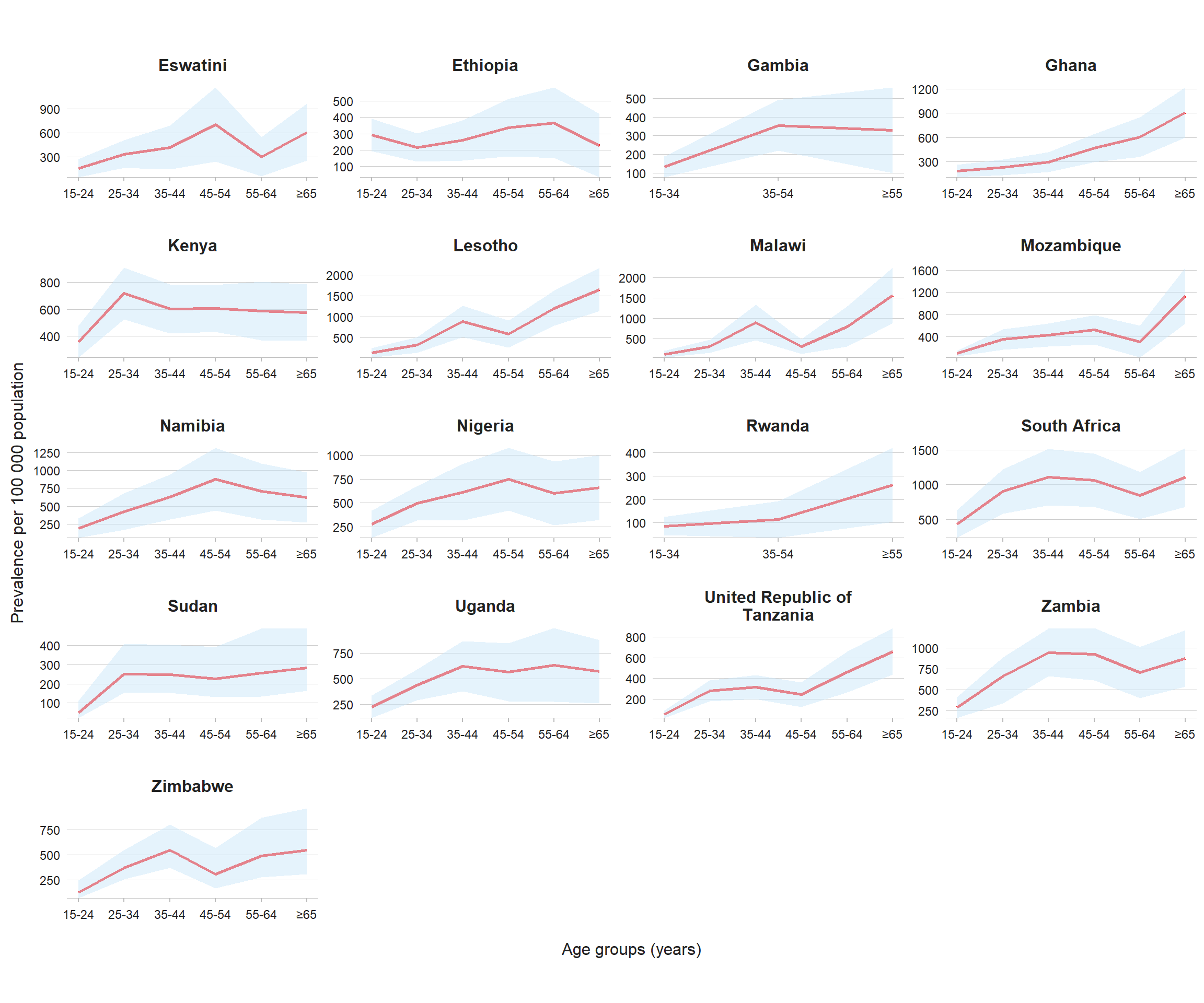 Lesotho, Malawi, Mozambique, Rwanda and the United Republic of Tanzania). Elsewhere, surveys suggested considerable community transmission; peaks in many African countries in the age groups 35–44 or 45–54 years also reflect the impact